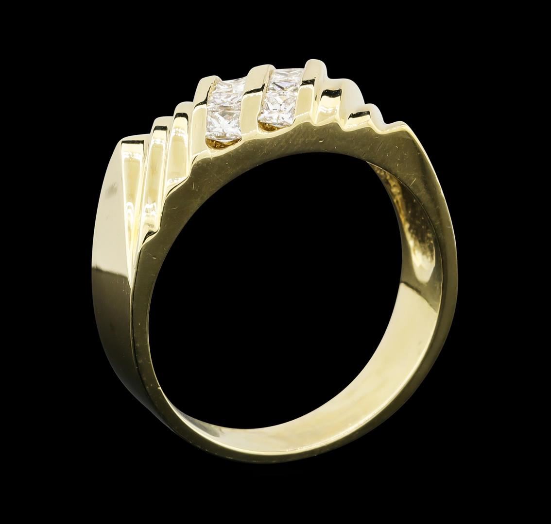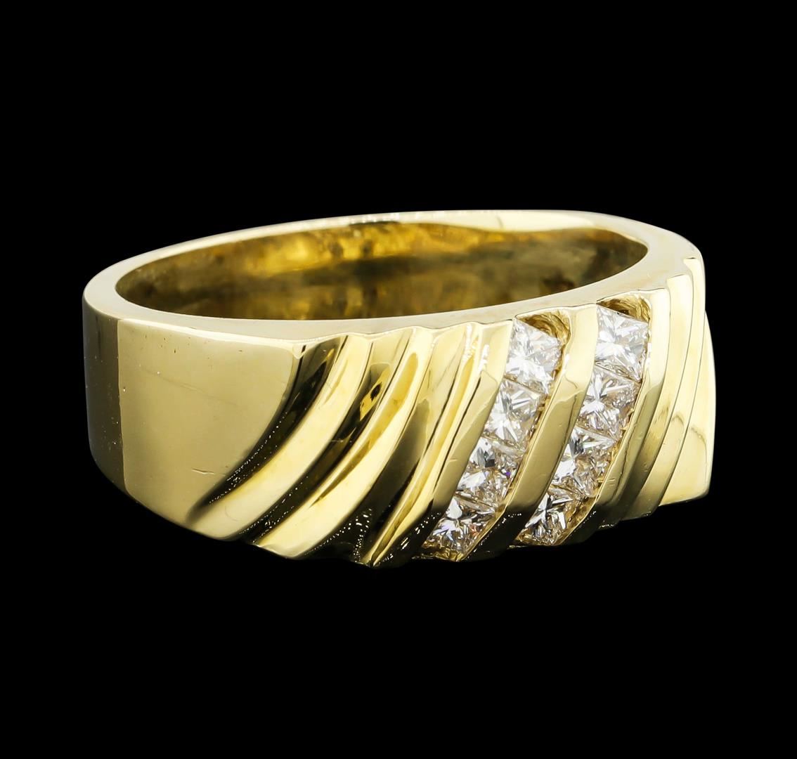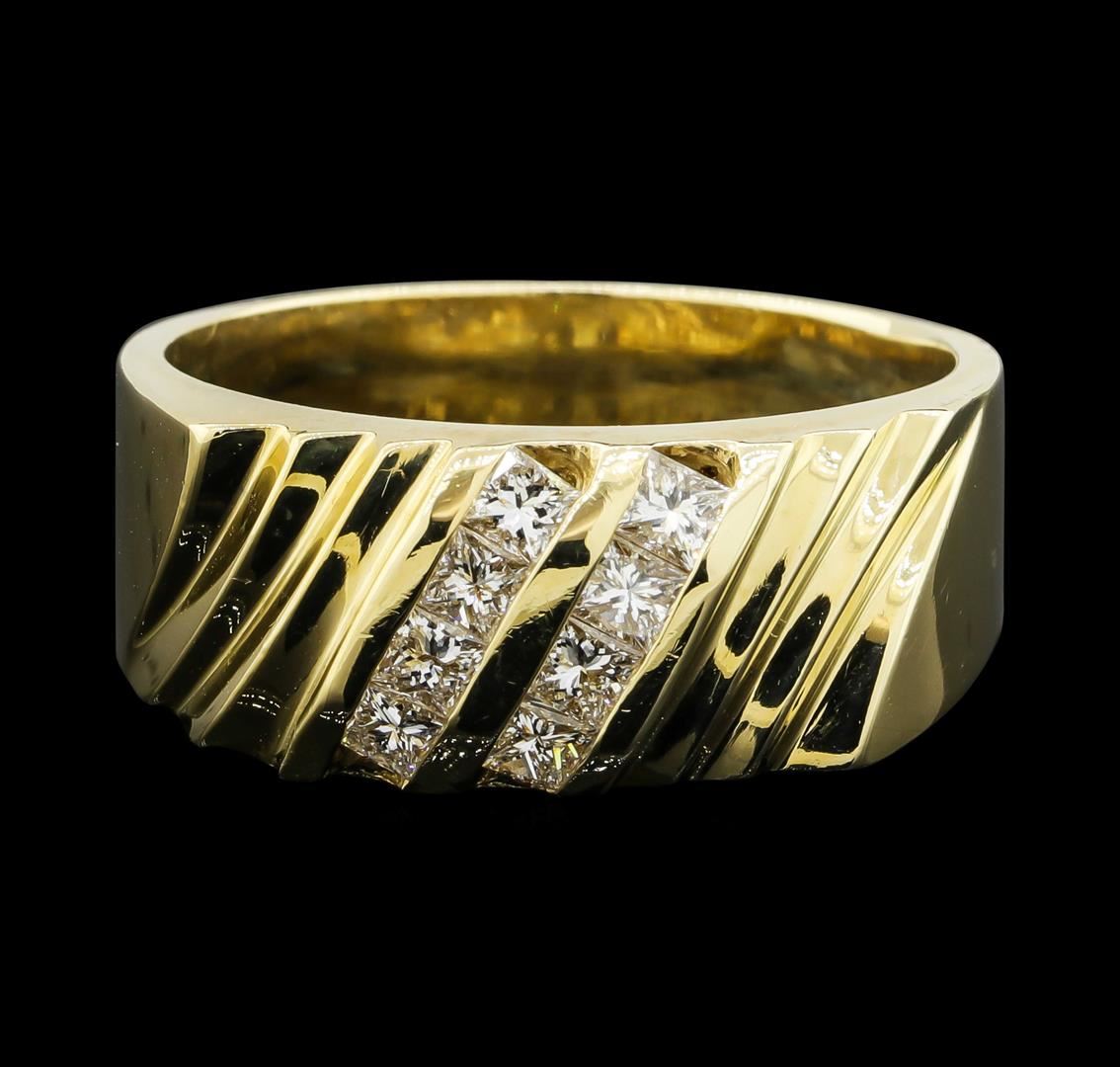 One electronically tested 14KT yellow gold man's cast wedding ring with a tapered shank with a bright polish finish. The featured man's ring has a shank measuring 5.05 millimeters wide. Identified with markings of "14K". Condition is like new, good workmanship. Containing: Eight channel set princess cut diamonds, measuring 2.40 x 2.35 x 1.76mm (depth est.) , 5.00.%. GTCF approximate total weight of 8 Stones = 0.70ct. Graded in the setting. Clarity: VS-1 to VS-2. Color: H - ICut Very Good. Total Weight of Diamonds 0.70ct. Total Weight of Ring 9.40gm. GAS Appraised at $3,150.00.
