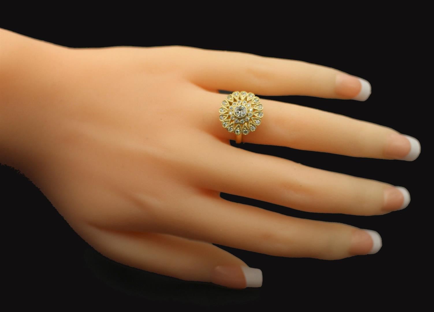 One 14K Yellow Gold Ladies Elegant Fashion Diamond Ring. Total carat weight is 0.73 Ct. Size 6.50 but resizable. Total gram weight 5.44 g. Condition is brand new. Center diamond weight 0.30 carats, shape brilliant round cut. Side diamonds total carats 0.43 ct. Color is G-H, clarity SI1- SI2, shape brilliant round cut, cut excellent.