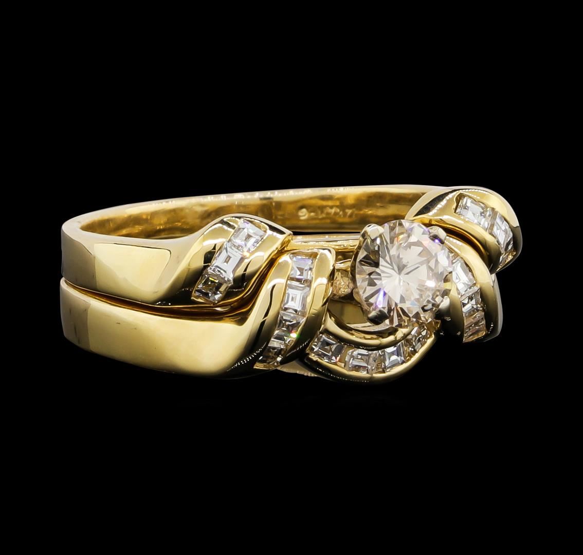 One Ladies wedding ring set featuring: 14KT yellow gold weighing 5.8 grams containing one center diamond weighing 0.43ct and side diamonds weighing 0.32ctw.