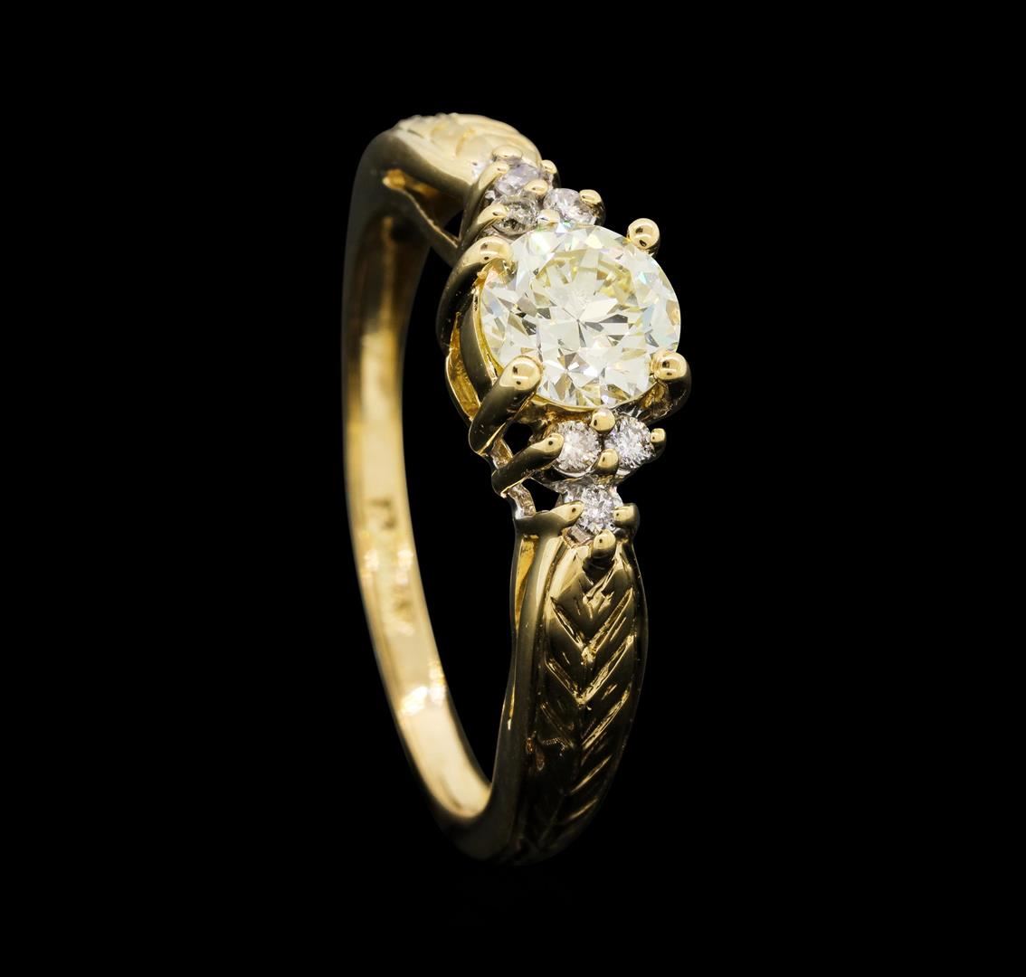 One electronically tested 14KT yellow gold lady's cast wedding ring with a tapered shank with a bright polish, hand-engraved detail finish. The featured lady's ring has a shank measuring 1.70 millimeters wide. Identified with markings of "14K". Condition is new, good workmanship. Containing: One prong set round brilliant cut diamond, measuring 5.70 - 5.65 x 3.53mm (depth est.) , 3.00.%. GTCF approximate weight of 0.72ct. Graded in the setting. Color L - MClarity VS-1 Cut Very Good Six prong set round brilliant cut diamonds, measuring 1.40 - 1.35 x 0.86mm (depth est.) approximate. Total Weight of 6 Stones = 0.06ct. Graded in the setting. Color I - JClarity SI-2 to I-1 Cut Good. Total Weight of Diamonds 0.78ct.. Total Weight of Ring 3.00gm. GAS Appraised.