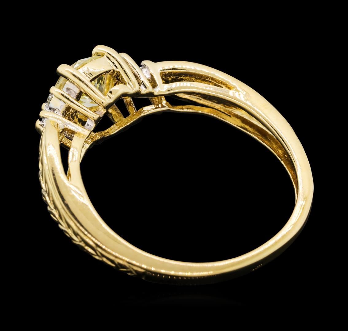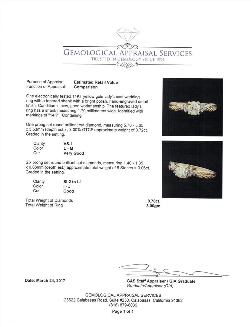 One electronically tested 14KT yellow gold lady's cast wedding ring with a tapered shank with a bright polish, hand-engraved detail finish. The featured lady's ring has a shank measuring 1.70 millimeters wide. Identified with markings of "14K". Condition is new, good workmanship. Containing: One prong set round brilliant cut diamond, measuring 5.70 - 5.65 x 3.53mm (depth est.) , 3.00.%. GTCF approximate weight of 0.72ct. Graded in the setting. Color L - MClarity VS-1 Cut Very Good Six prong set round brilliant cut diamonds, measuring 1.40 - 1.35 x 0.86mm (depth est.) approximate. Total Weight of 6 Stones = 0.06ct. Graded in the setting. Color I - JClarity SI-2 to I-1 Cut Good. Total Weight of Diamonds 0.78ct.. Total Weight of Ring 3.00gm. GAS Appraised.