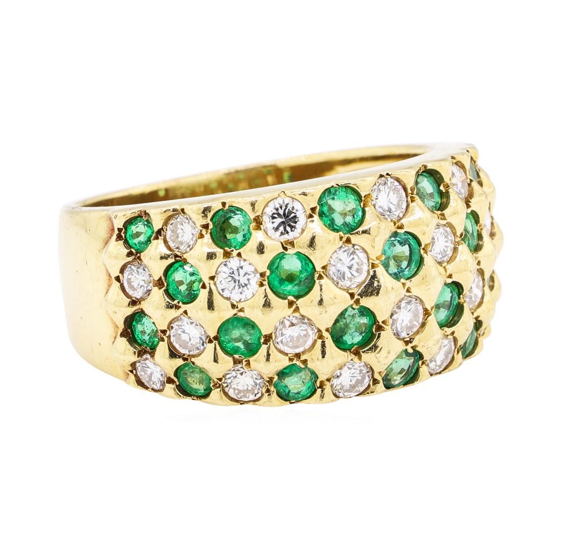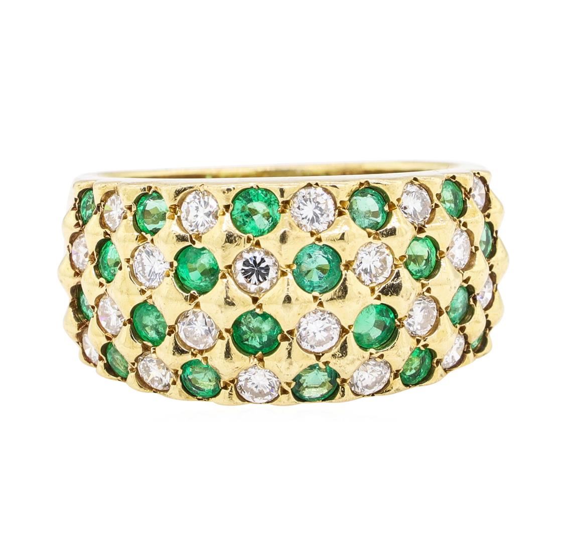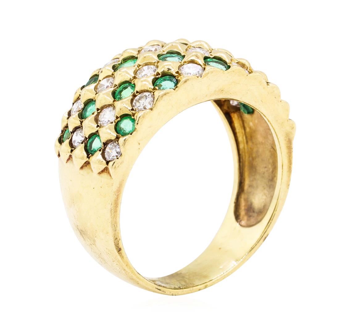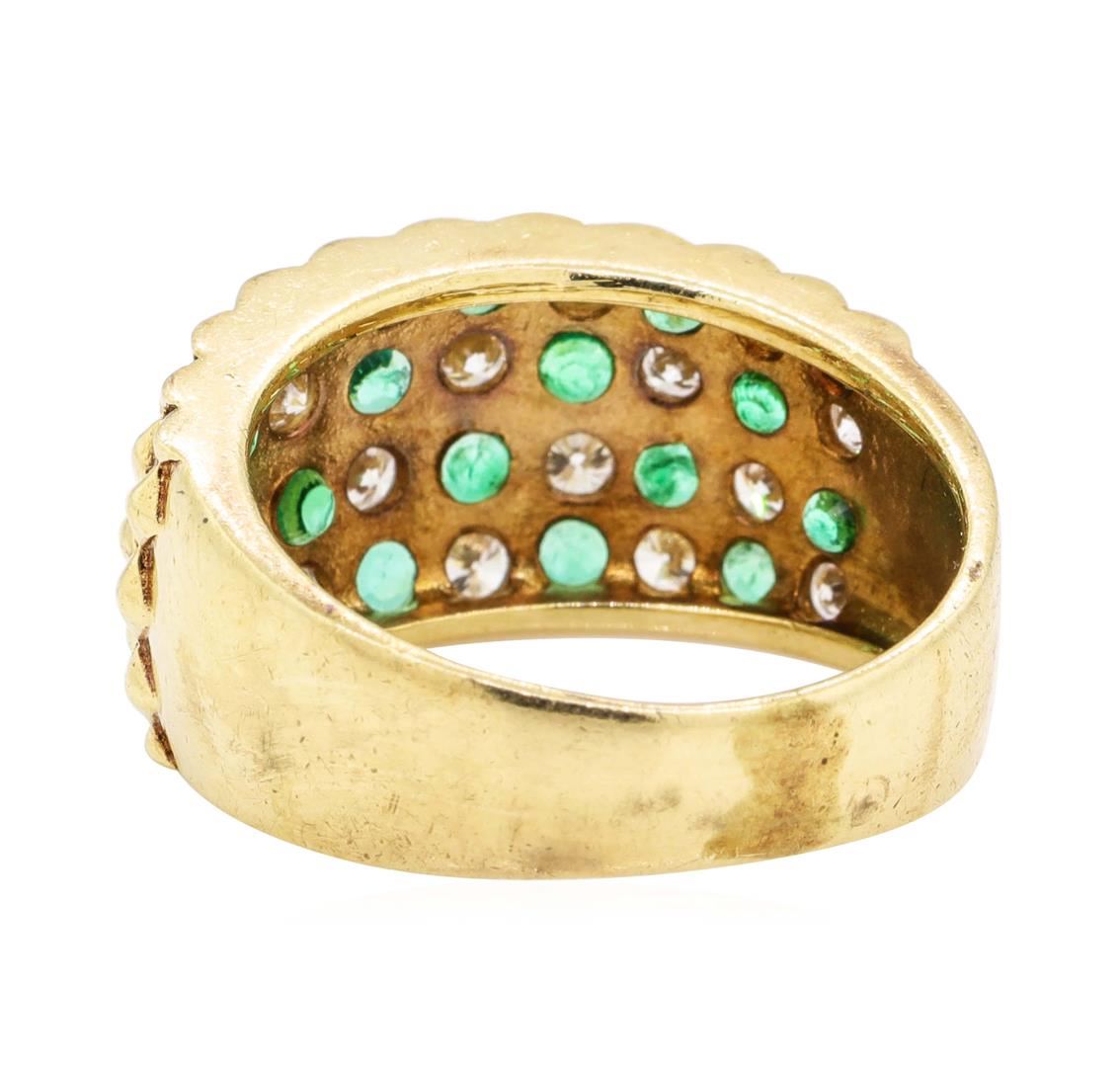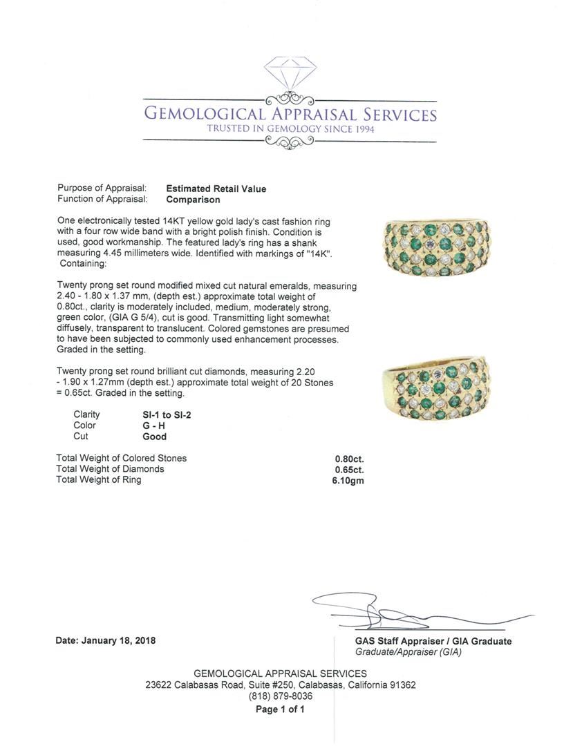 One electronically tested 14KT yellow gold ladies cast fashion ring with a four row wide band with a bright polish finish. The featured ladies ring has a shank measuring 4.45 millimeters wide. Identified with markings of '14K'. Condition is used, good workmanship. Containing: Twenty prong set round modified mixed cut natural emeralds, measuring 2.40 - 1.80 x 1.37 mm, (depth est.) approximate total weight of 0.80ct., clarity is moderately included, medium, moderately strong, green color, (GIA G 5/4), cut is good. Transmitting light somewhat diffusely, transparent to translucent. Colored gemstones are presumed to have been subjected to commonly used enhancement processes. Graded in the setting. Twenty prong set round brilliant cut diamonds, measuring 2.20 - 1.90 x 1.27mm (depth est.) approximate total weight of 20 Stones = 0.65ct. Graded in the setting. Color G - H Clarity SI-1 to SI-2 Cut Good. Total Weight of Colored Stones 0.80ct. Total Weight of Diamonds 0.65ct. Total Weight of Ring 6.10gm. GAS Appraised.