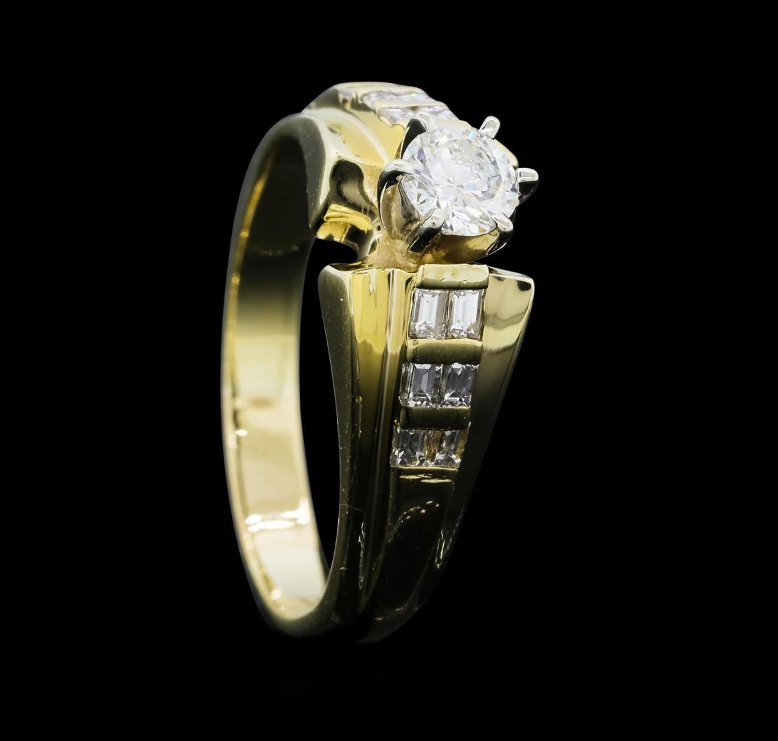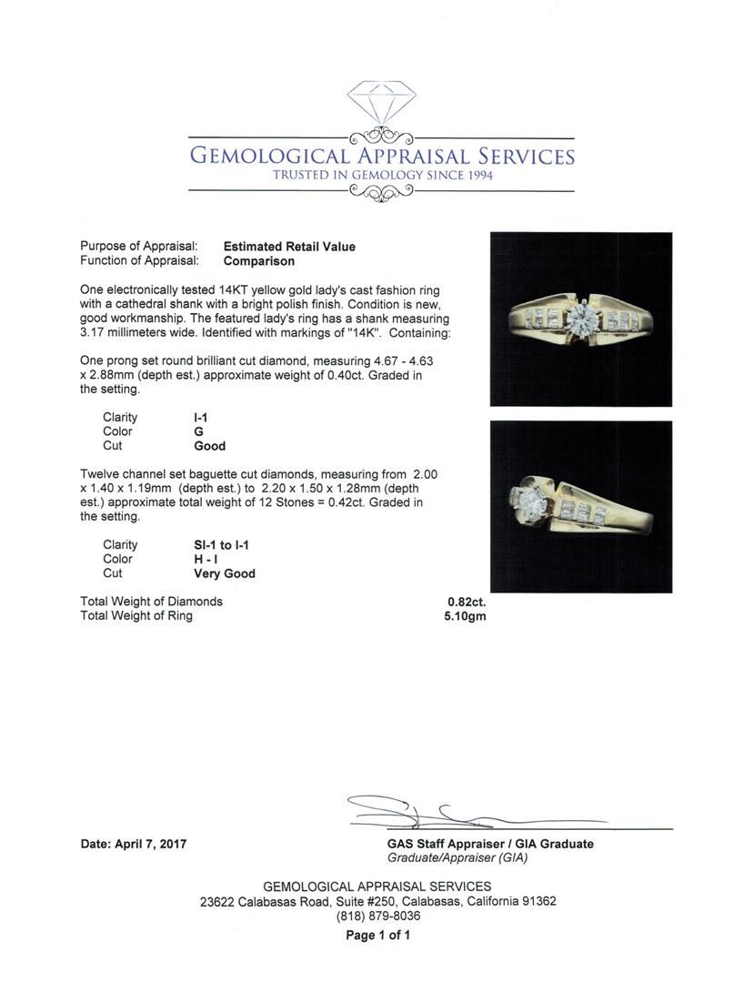 One electronically tested 14KT yellow gold lady's cast fashion ring with a cathedral shank with a bright polish finish. The featured lady's ring has a shank measuring 3.17 millimeters wide. Identified with markings of "14K". Condition is new, good workmanship. Containing: One prong set round brilliant cut diamond, measuring 4.67 - 4.63 x 2.88mm (depth est.) approximate weight of 0.40ct. Graded in the setting. Color G, Clarity I-1 Cut Good Twelve channel set baguette cut diamonds, measuring from 2.00 x 1.40 x 1.19mm (depth est.) to 2.20 x 1.50 x 1.28mm (depth est.) approximate total weight of 12 Stones = 0.42ct. Graded in the setting. Color H - I Clarity SI-1 to I-1 Cut Very Good. Total Weight of Diamonds 0.82ct. Total Weight of Ring 5.10gm. GAS Appraised.