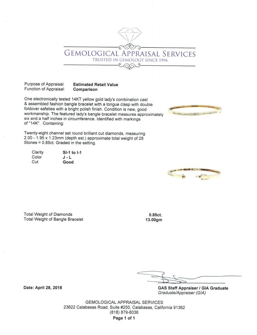 One electronically tested 14KT yellow gold Ladies combination cast & assembled fashion bangle bracelet with a tongue clasp with double foldover safeties with a bright polish finish. The featured Ladies bangle bracelet measures approximately six and a half inches in circumference. Identified with markings of '14K'. Condition is new, good workmanship. Containing: Twenty-Eight channel set round brilliant cut diamonds, measuring 2.00 - 1.95 x 1.23mm (depth est.) approximate total weight of 28 Stones = 0.85ct. Graded in the setting. Color J - L Clarity SI-1 to I-1 Cut Good. Total Weight of Diamonds 0.85ct.. Total Weight of Bangle Bracelet 13.00gm. GAS Appraised.