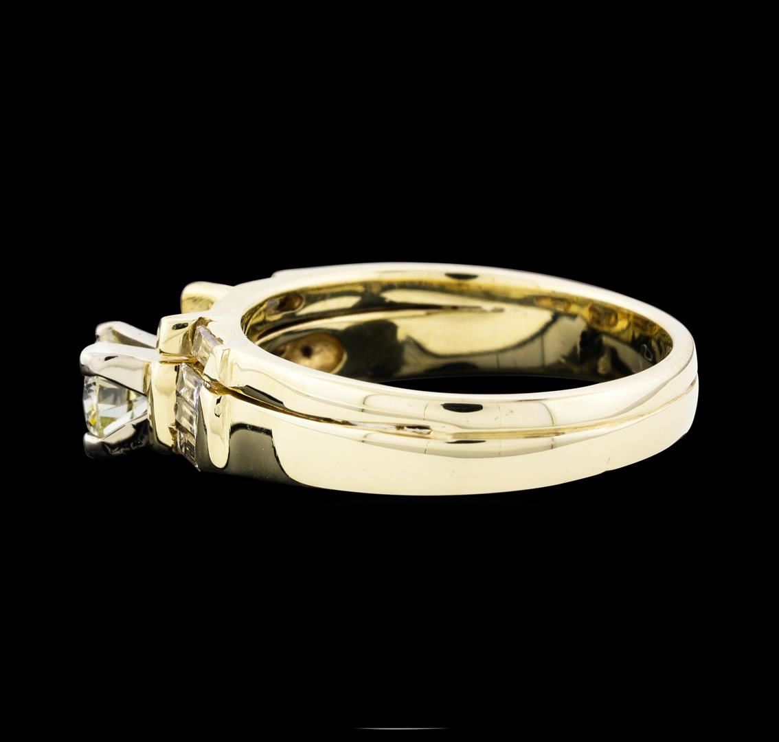 One electronically tested 14KT yellow gold lady's combination cast & assembled wedding ring soldered to wedding band with a tapered shank with a bright polish finish. The featured lady's wedding ring and band have a double shank measuring 3.47 millimeters wide. Identified with markings of "14K". Condition is new, good workmanship. Containing: One prong set round brilliant cut diamond, measuring 5.09 - 5.04 x 3.14mm (depth est.) approximate weight of 0.50ct. Graded in the setting. Clarity: SI-1. Color: K - LCut Very Good Eight channel set baguette cut diamonds, measuring from 3.20 x 1.20 x 1.02mm (depth est.) to 3.50 x 1.40 x 1.19mm (depth est.) approximate total weight of 8 Stones = 0.35ct. Graded in the setting. Clarity: VS-1 to VS-2. Color: H - ICut Good. Total Weight of Diamonds 0.85ct. Total Weight of Ring Soldered To Wedding Band 4.70gm. GAS Appraised.