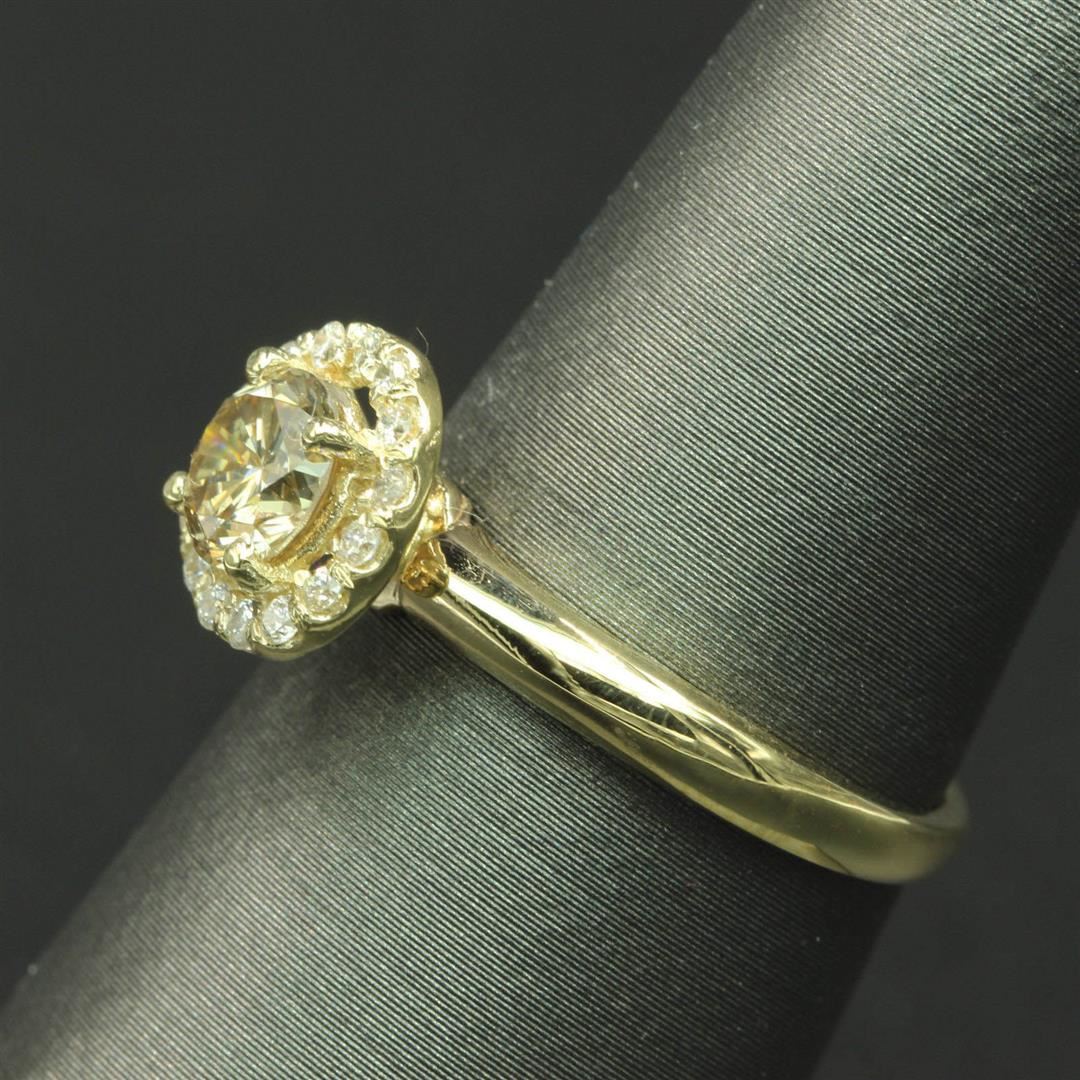 One Natural Brilliant Round Cut Diamond Solitaire Engagement Wedding Ring in 14K Yellow Gold. Setting style of ring is solitaire and traditional. Total carat weight is 0.90 carats with a gross weight of 3.30 grams. Total number of stones is 16. Size is 6.75 but can be resizable free of charge. Condition is brand new. Main stone is non-enhanced and natural. Main diamond is 0.75 carats. Main diamond shape is brilliant round cut, clarity SI1, color is fancy brown, cut is excellent. Side stone is non-enhanced and natural. Side diamond total carat is 0.15 carats, shape brilliant round cut, clarity SI1, color G, and side diamond cut is excellent.