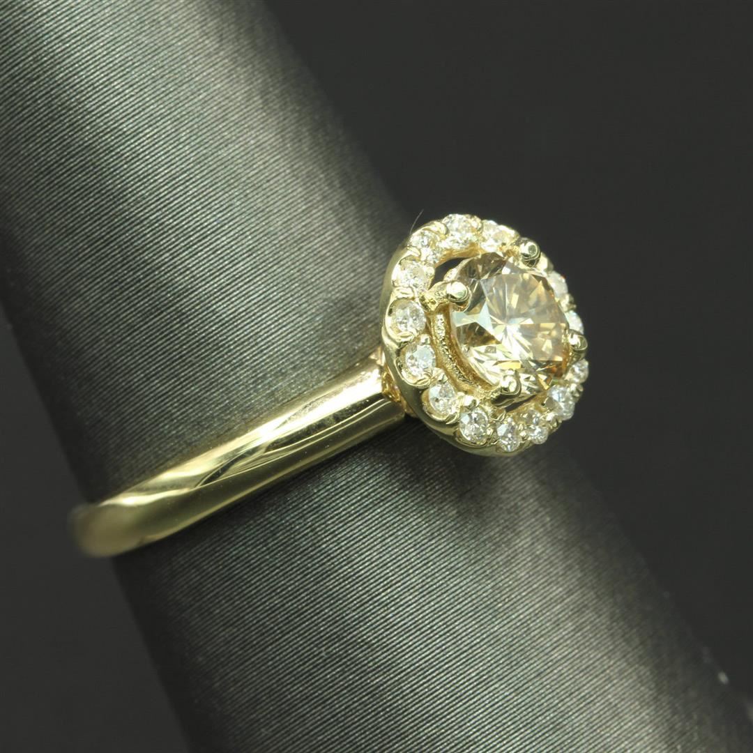 One Natural Brilliant Round Cut Diamond Solitaire Engagement Wedding Ring in 14K Yellow Gold. Setting style of ring is solitaire and traditional. Total carat weight is 0.90 carats with a gross weight of 3.30 grams. Total number of stones is 16. Size is 6.75 but can be resizable free of charge. Condition is brand new. Main stone is non-enhanced and natural. Main diamond is 0.75 carats. Main diamond shape is brilliant round cut, clarity SI1, color is fancy brown, cut is excellent. Side stone is non-enhanced and natural. Side diamond total carat is 0.15 carats, shape brilliant round cut, clarity SI1, color G, and side diamond cut is excellent.
