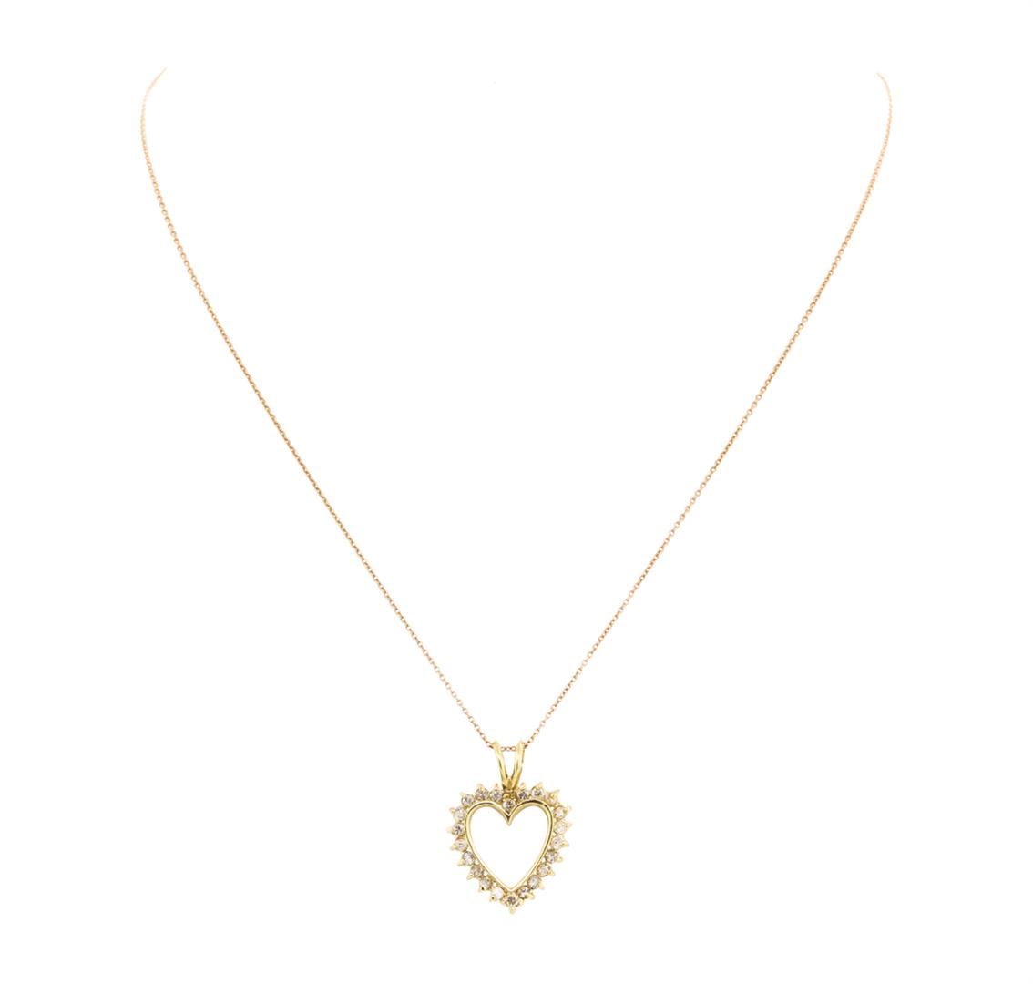 One heart shaped pendant with chain featuring: 14KT yellow and rose gold weighing 4.0 grams containing diamonds weighing 1.00ctw. The chain measures approximately eighteen inches in length.
