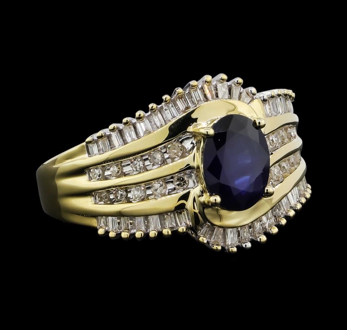 One 14KT Yellow Gold 1.00ct Sapphire and Diamond Ring. (1) sapphire with a total weight of 1.00cts. Diamonds with a total weight of 0.60cts. Total weight of the ring is 5.20 grams.