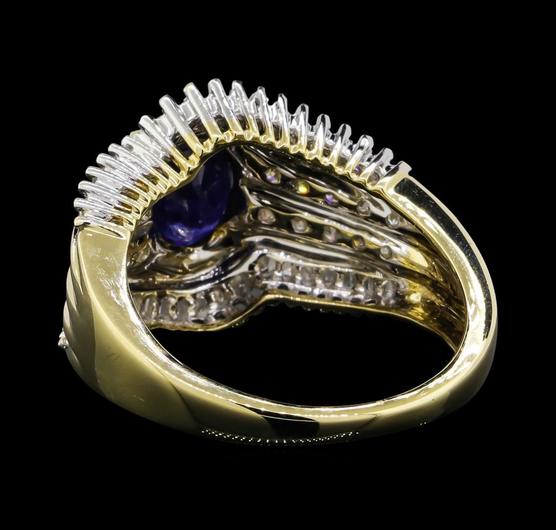 One 14KT Yellow Gold 1.00ct Sapphire and Diamond Ring. (1) sapphire with a total weight of 1.00cts. Diamonds with a total weight of 0.60cts. Total weight of the ring is 5.20 grams.