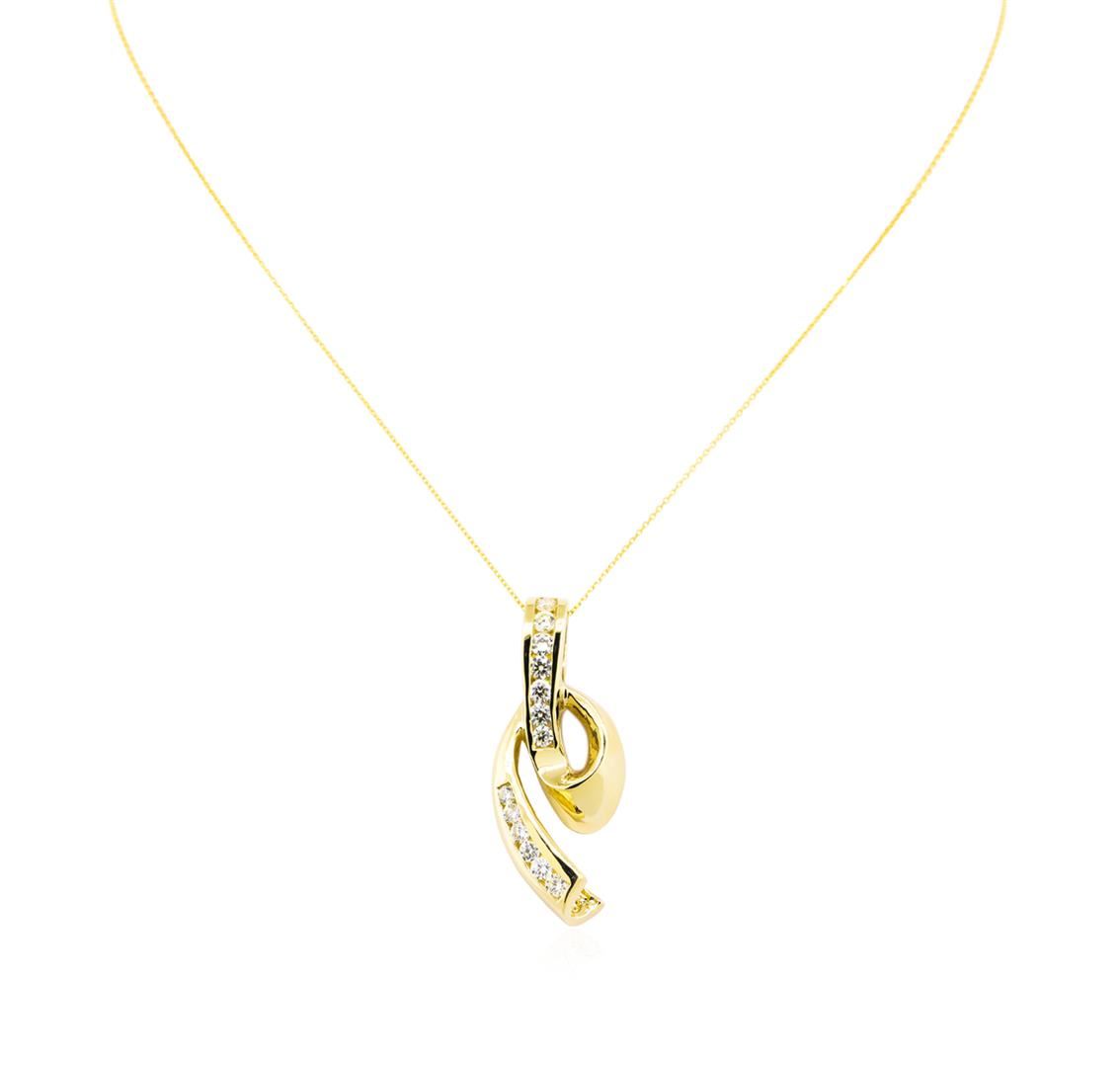 One electronically tested 14KT yellow gold lady's cast fashion pendant & chain 16.0" long, 1mm diamond cut oval cable link with a spring ring clasp with a bright polish finish. The featured lady's pendant has a looping twisted ribbon motif. Identified with markings of "14K". Condition is new, good workmanship. Containing: Thirteen channel set round brilliant cut diamonds, measuring 2.90 - 2.60 x 1.68mm (depth est.) approximate. Total Weight of 13 Stones = 1.00ct. Graded in the setting. Clarity: VS-2 to SI-1. Color: H - J, Cut Good. Total Weight of Diamonds 1.00ct. Total Weight of Pendant & Chain 9.40gm. GAS Appraised.
