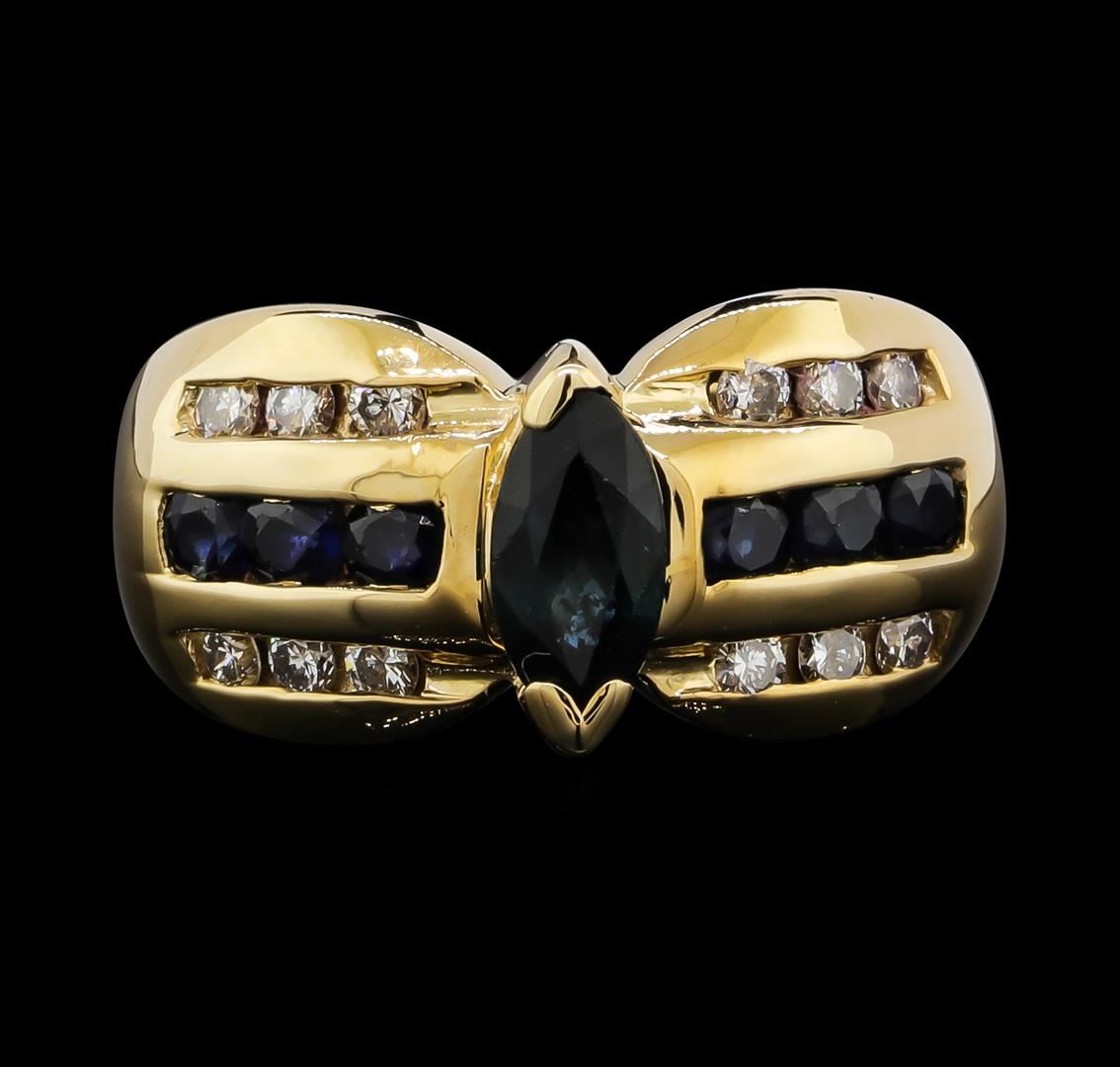 One 14KT Yellow Gold 1.00ctw Sapphire and Diamond Ring. 1 center stone sapphire with a total weight of 0.50cts. (6) sapphires with a total weight of 0.50cts. Diamonds with a total weight of 0.15cts. Total weight of the ring is 6.80 grams.