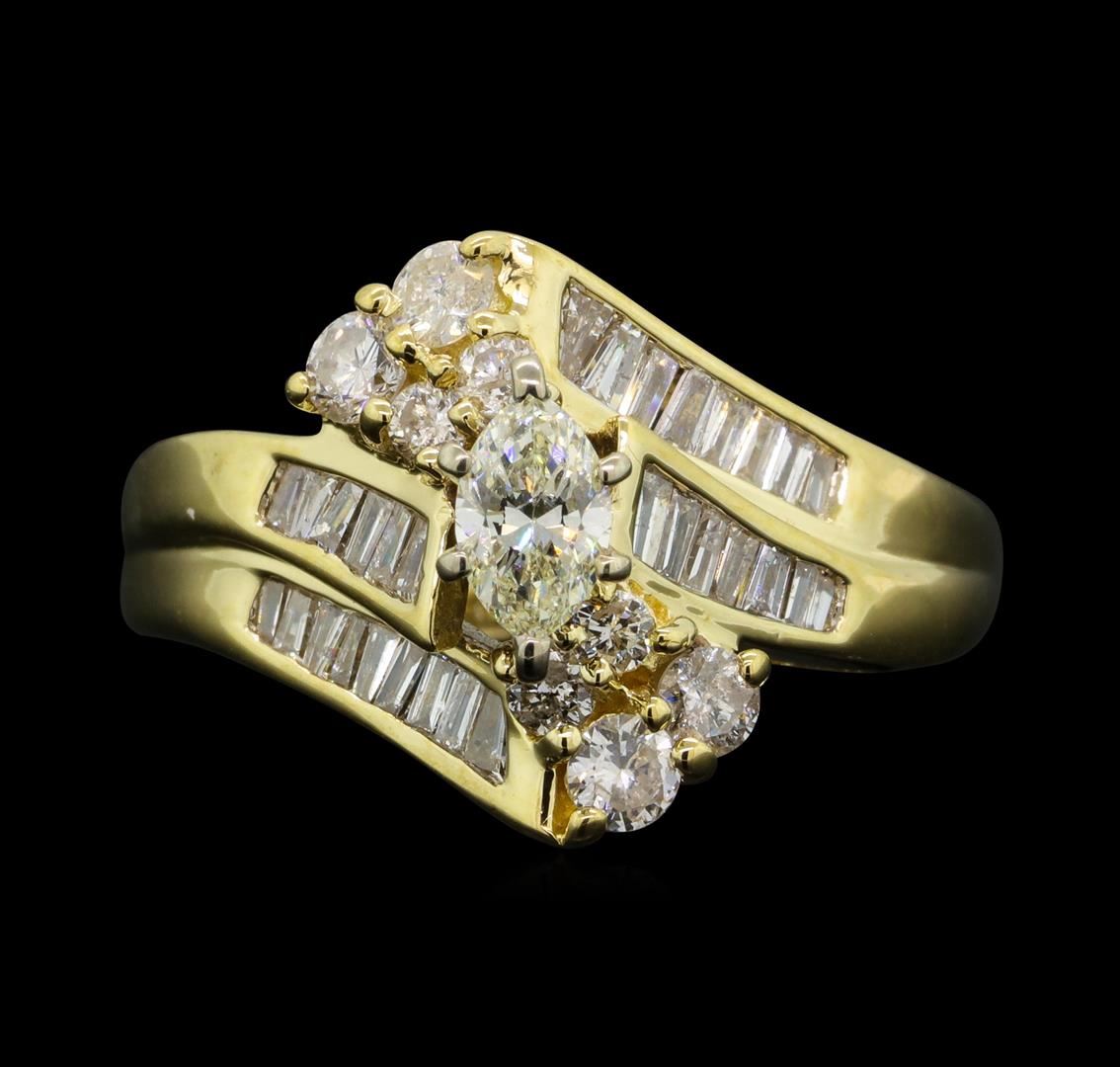 One electronically tested 14KT yellow gold lady's combination cast & assembled wedding ring with a bypass shank with a bright polish finish. The featured lady's ring has a shank measuring 2.07 millimeters wide. Identified with markings of "14K". Condition is new, good workmanship. Containing: One prong set marquise shaped cut diamond, measuring 6.10 x 3.50 x 2.21mm (depth est.) approximate weight of 0.30ct. Graded in the setting. Color J - KClarity SI-1 Cut Good Four prong set round brilliant cut diamonds, measuring 2.70 - 2.65 x 1.66mm (depth est.) approximate total weight of 4 Stones = 0.24ct. Graded in the setting. Color H - I Clarity SI-2 to I-1 Cut Good Four prong set round brilliant cut diamonds, measuring 1.90 - 1.80 x 1.15mm (depth est.) approximate total weight of 4 Stones = 0.10ct. Graded in the setting. Color H - I Clarity SI-2 to I-1 Cut Good Thirty channel set baguette cut (tapered) diamonds, measuring from 1.80 x 0.90 x 0.77mm (depth est.) to 1.90 x 1.00 x 0.85mm (depth est.) approximate total weight of 30 Stones = 0.39ct. Graded in the setting. Color H - I Clarity SI-1 to I-1 Cut Good. Total Weight of Diamonds 1.03ct. Total Weight of Ring 5.50gm. GAS Appraised.