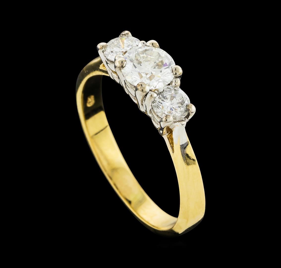 One electronically tested 14KT yellow with rhodium plating gold lady's cast 3-stone ring with a tapered shank with a bright polish finish. The featured lady's ring has a shank measuring 2.58 millimeters wide. Identified with markings of "14K". Condition is used, good workmanship. Containing: One prong set round brilliant cut diamond, measuring 5.47 - 5.45 x 3.28mm (depth est.) approximate weight of 0.60ct. Graded in the setting. Clarity: SI-1. Color: ICut Very Good Two prong set round brilliant cut diamonds, measuring 3.93 - 3.87 x 2.42mm (depth est.) approximate total weight of 2 Stones = 0.46ct. Graded in the setting. Clarity: SI-2 to I-1. Color: H - ICut Good. Total Weight of Diamonds 1.06ct. Total Weight of Ring 3.30gm. GAS Appraised.