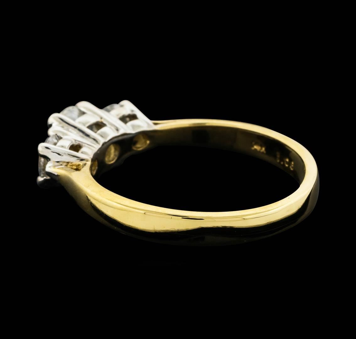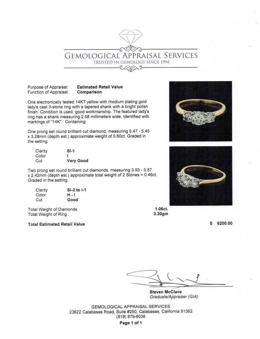 One electronically tested 14KT yellow with rhodium plating gold lady's cast 3-stone ring with a tapered shank with a bright polish finish. The featured lady's ring has a shank measuring 2.58 millimeters wide. Identified with markings of "14K". Condition is used, good workmanship. Containing: One prong set round brilliant cut diamond, measuring 5.47 - 5.45 x 3.28mm (depth est.) approximate weight of 0.60ct. Graded in the setting. Clarity: SI-1. Color: ICut Very Good Two prong set round brilliant cut diamonds, measuring 3.93 - 3.87 x 2.42mm (depth est.) approximate total weight of 2 Stones = 0.46ct. Graded in the setting. Clarity: SI-2 to I-1. Color: H - ICut Good. Total Weight of Diamonds 1.06ct. Total Weight of Ring 3.30gm. GAS Appraised at $6,200.00.