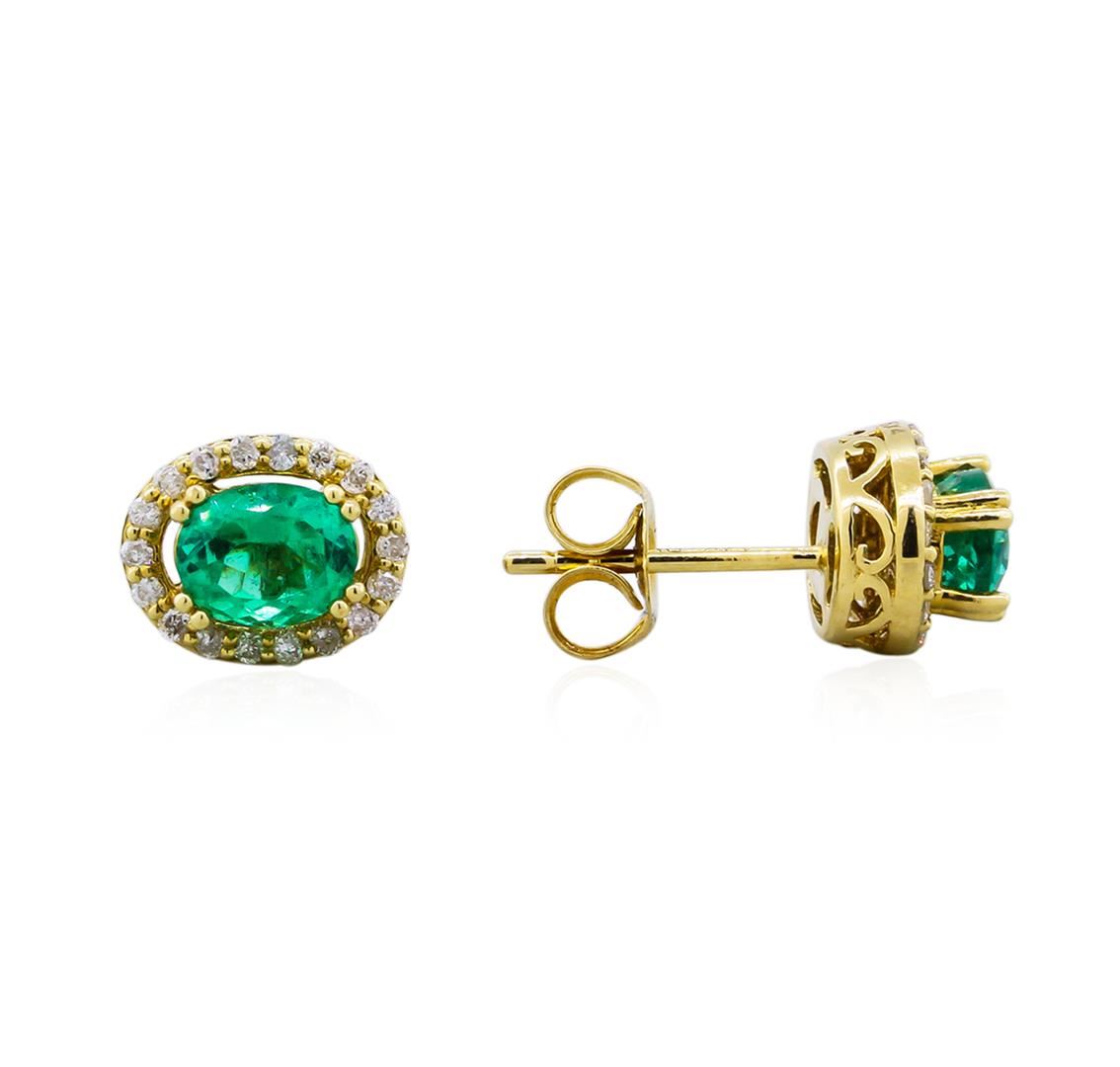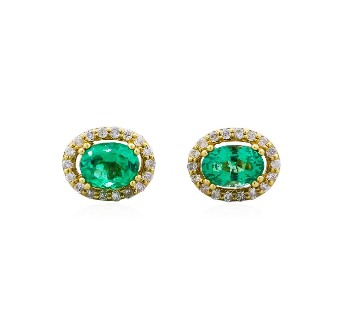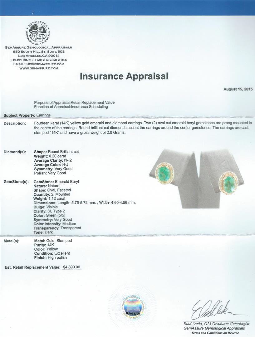 14KT yellow gold emerald and diamond earrings. 2 oval cut emerald beryl gemstones weighing in collectively at an aproximate 1.12 carats are prong mounted in the center of the earrings. Approximately 0.20 carats of round brilliant cut diamonds accent the earrings around the center gemstones. The earrings are cast stamped "14K" and have a gross weight of 2.0 grams. Condition: Excellent GGA Appraised at $4,890.00.
