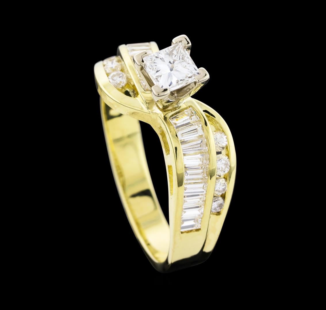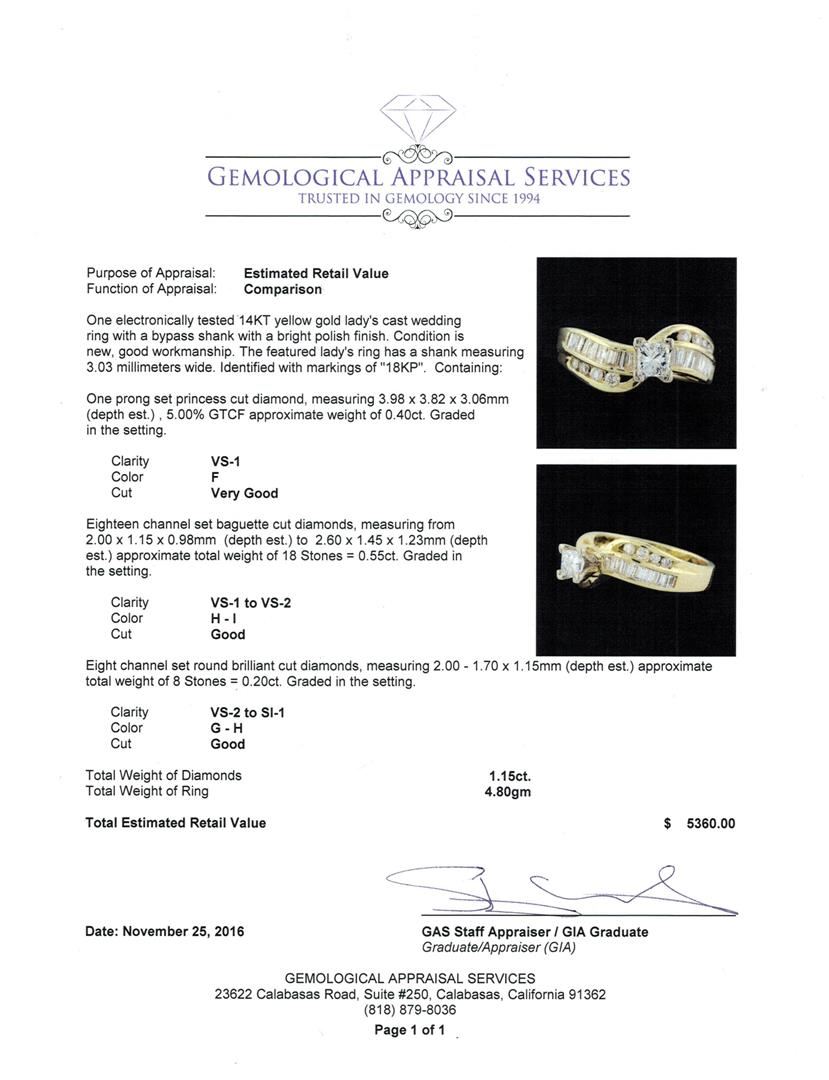 One electronically tested 14KT yellow gold lady's cast wedding ring with a bypass shank with a bright polish finish. The featured lady's ring has a shank measuring 3.03 millimeters wide. Identified with markings of "18KP". Condition is new, good workmanship. Containing: One prong set princess cut diamond, measuring 3.98 x 3.82 x 3.06mm (depth est.) , 5.00.%. GTCF approximate weight of 0.40ct. Graded in the setting. Clarity: VS-1. Color: FCut Very Good Eighteen channel set baguette cut diamonds, measuring from 2.00 x 1.15 x 0.98mm (depth est.) to 2.60 x 1.45 x 1.23mm (depth est.) approximate total weight of 18 Stones = 0.55ct. Graded in the setting. Clarity: VS-1 to VS-2. Color: H - ICut Good Eight channel set round brilliant cut diamonds, measuring 2.00 - 1.70 x 1.15mm (depth est.) approximate total weight of 8 Stones = 0.20ct. Graded in the setting. Clarity: VS-2 to SI-1. Color: G - HCut Good. Total Weight of Diamonds 1.15ct. Total Weight of Ring 4.80gm. GAS Appraised at $5,360.00.