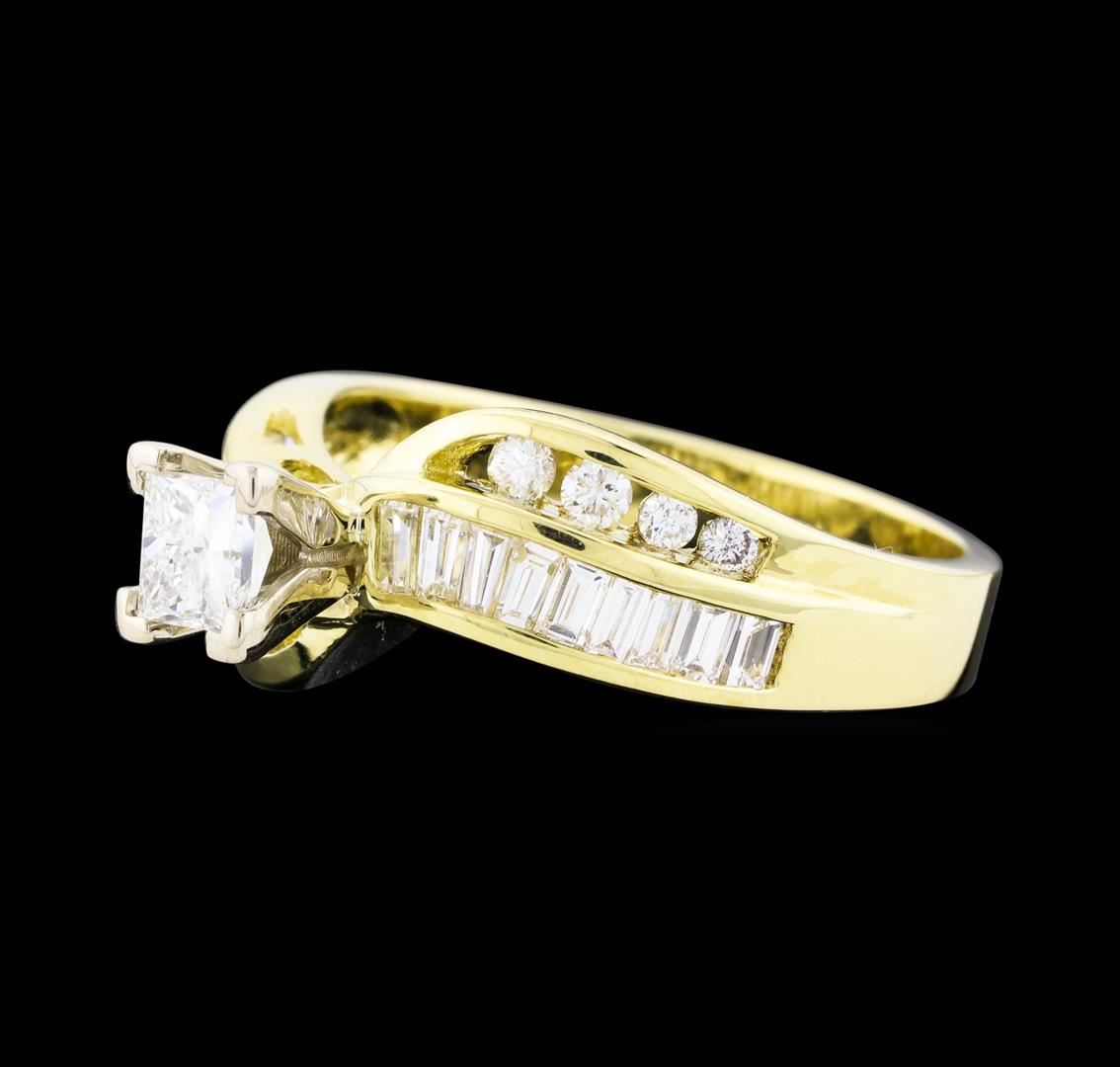 One electronically tested 14KT yellow gold lady's cast wedding ring with a bypass shank with a bright polish finish. The featured lady's ring has a shank measuring 3.03 millimeters wide. Identified with markings of "18KP". Condition is new, good workmanship. Containing: One prong set princess cut diamond, measuring 3.98 x 3.82 x 3.06mm (depth est.) , 5.00.%. GTCF approximate weight of 0.40ct. Graded in the setting. Clarity: VS-1. Color: FCut Very Good Eighteen channel set baguette cut diamonds, measuring from 2.00 x 1.15 x 0.98mm (depth est.) to 2.60 x 1.45 x 1.23mm (depth est.) approximate total weight of 18 Stones = 0.55ct. Graded in the setting. Clarity: VS-1 to VS-2. Color: H - ICut Good Eight channel set round brilliant cut diamonds, measuring 2.00 - 1.70 x 1.15mm (depth est.) approximate total weight of 8 Stones = 0.20ct. Graded in the setting. Clarity: VS-2 to SI-1. Color: G - HCut Good. Total Weight of Diamonds 1.15ct. Total Weight of Ring 4.80gm. GAS Appraised.