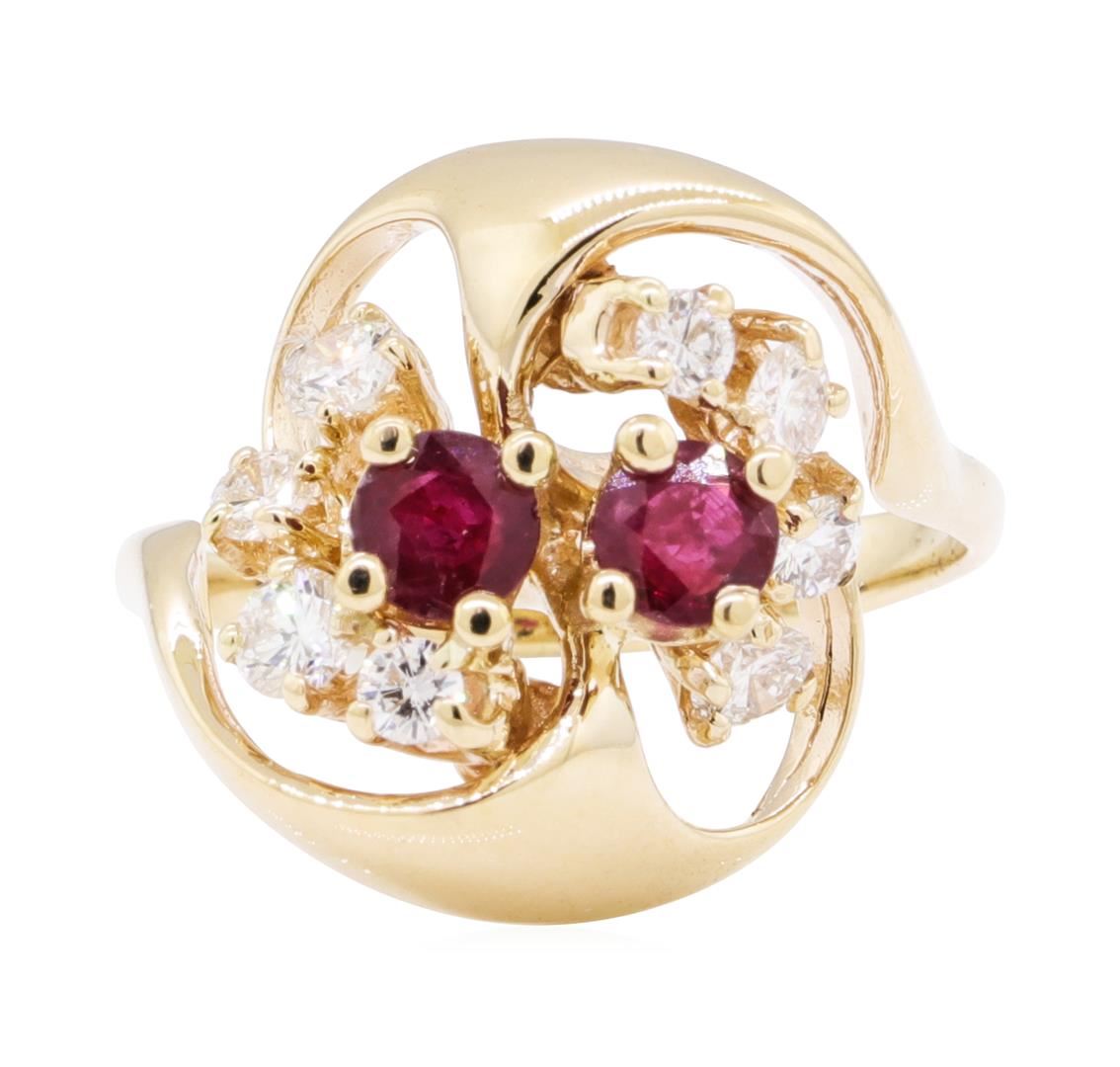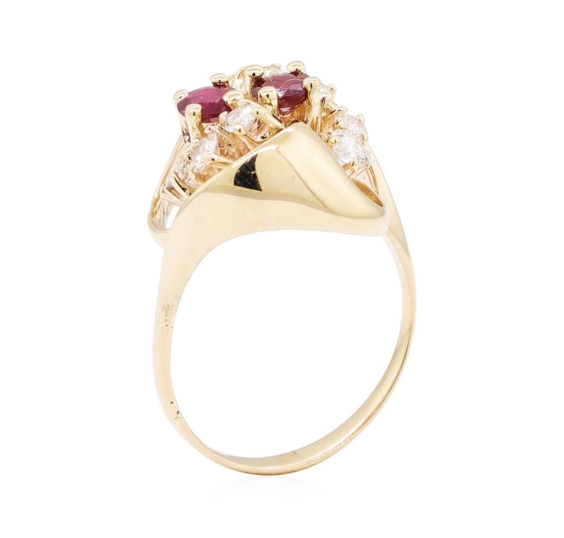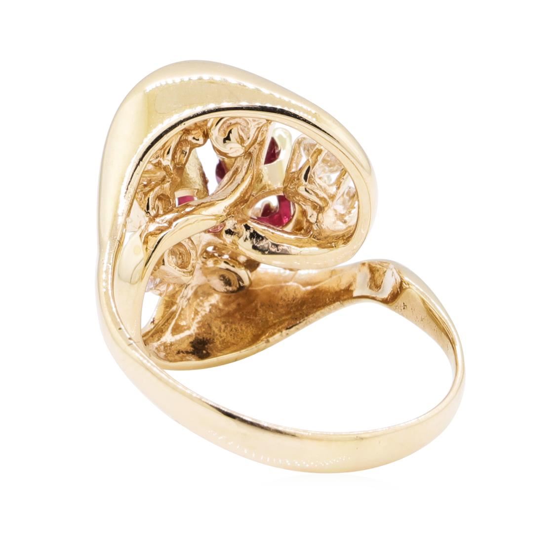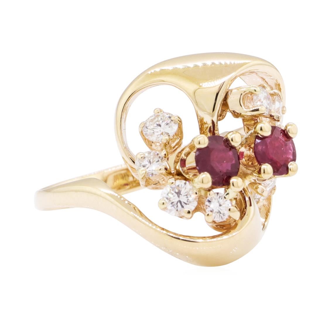 One freeform waterfall lady's ring featuring: 14KT yellow gold weighing 5.9 grams containing diamonds weighing 0.70ctw and rubies weighing 0.50ctw. The ring is a size 7.