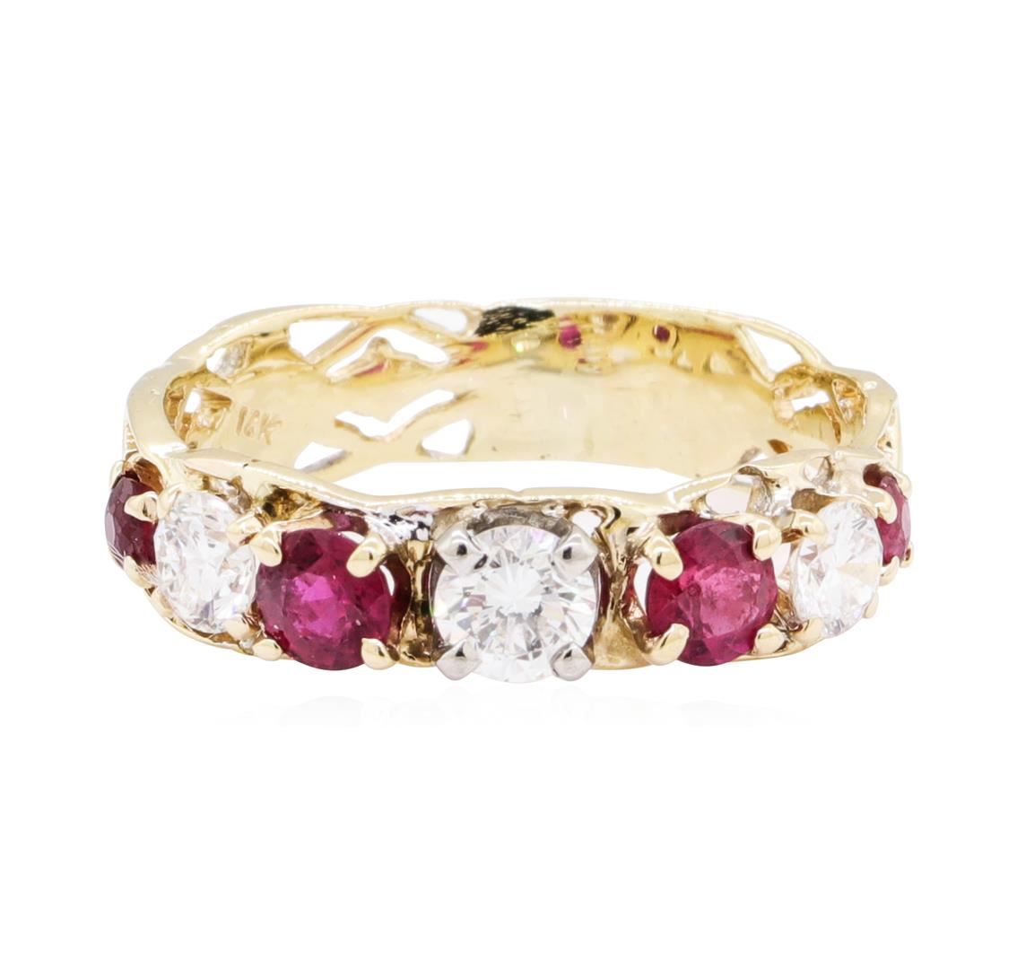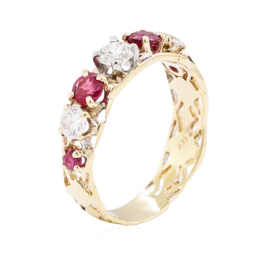 One electronically tested 14KT yellow gold lady's combination cast & assembled fashion ring with a scalloped filigree shank with a bright polish finish. The featured lady's ring has a shank measuring 4.20 millimeters wide. Identified with markings of '14K'. Condition is used, good workmanship. Containing: Two prong set round modified mixed cut natural rubies, measuring 3.65 - 3.65 x 2.25 mm, (depth est.) approximate total weight of 0.50ct.,, Clarity is eye clean, medium, moderately strong, red color, (GIA R 5/4), cut is good. Transmitting light with no distortion, transparent. Colored gemstones are presumed to have been subjected to commonly used enhancement processes. Graded in the setting. Two prong set round modified mixed cut natural rubies, measuring 2.60 - 2.50 x 1.66 mm, (depth est.) approximate total weight of 0.20ct.,, Clarity is slightly included, medium, moderately strong, red color, (GIA R 5/4), cut is good. Transmitting light somewhat diffusely, transparent to translucent. Colored gemstones are presumed to have been subjected to commonly used enhancement processes. The featured rubies have surface abrasions. Graded in the setting. Three prong set round brilliant cut diamonds, measuring 3.90 - 3.40 x 2.26mm (depth est.) approximate total weight of 3 Stones = 0.55ct. Graded in the setting. Color H - I, Clarity VS-2 to SI-1, Cut Good. Total Weight of Colored Stones 0.70ct. Total Weight of Diamonds 0.55ct. Total Weight of Ring 2.90gm. GAS Appraised.