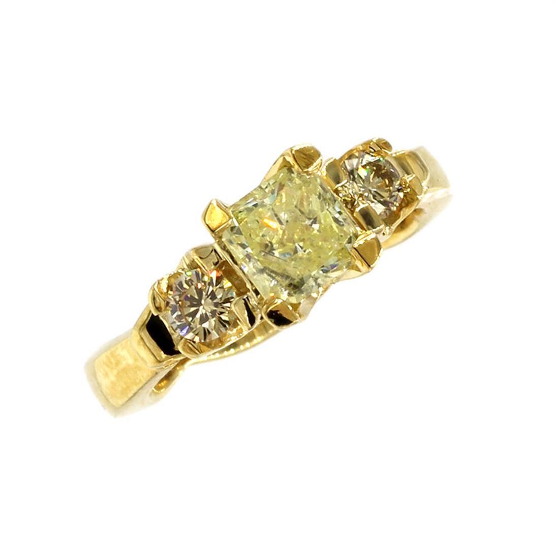One Princess & Round Cut Three Stone Diamond Band Ring in 14k Yellow Gold. The ring has a 3 stone setting style with a total stone weight of 1.25 carats. Gross weight is 5.00 grams and the ring is size 5 but can be resized free of charge. Condition is brand new. Main stone is not enhanced and natural. Main diamond weight is 1.02 carats, shape is radiant cut, clarity SI1, color I-J, and cut is excellent. Side stone is not enhanced and natural. Side diamond total weight is 0.23 carats, shape is brilliant round cut, clarity SI1, color I-J, cut is fine, and includes a total of 2 side diamonds.