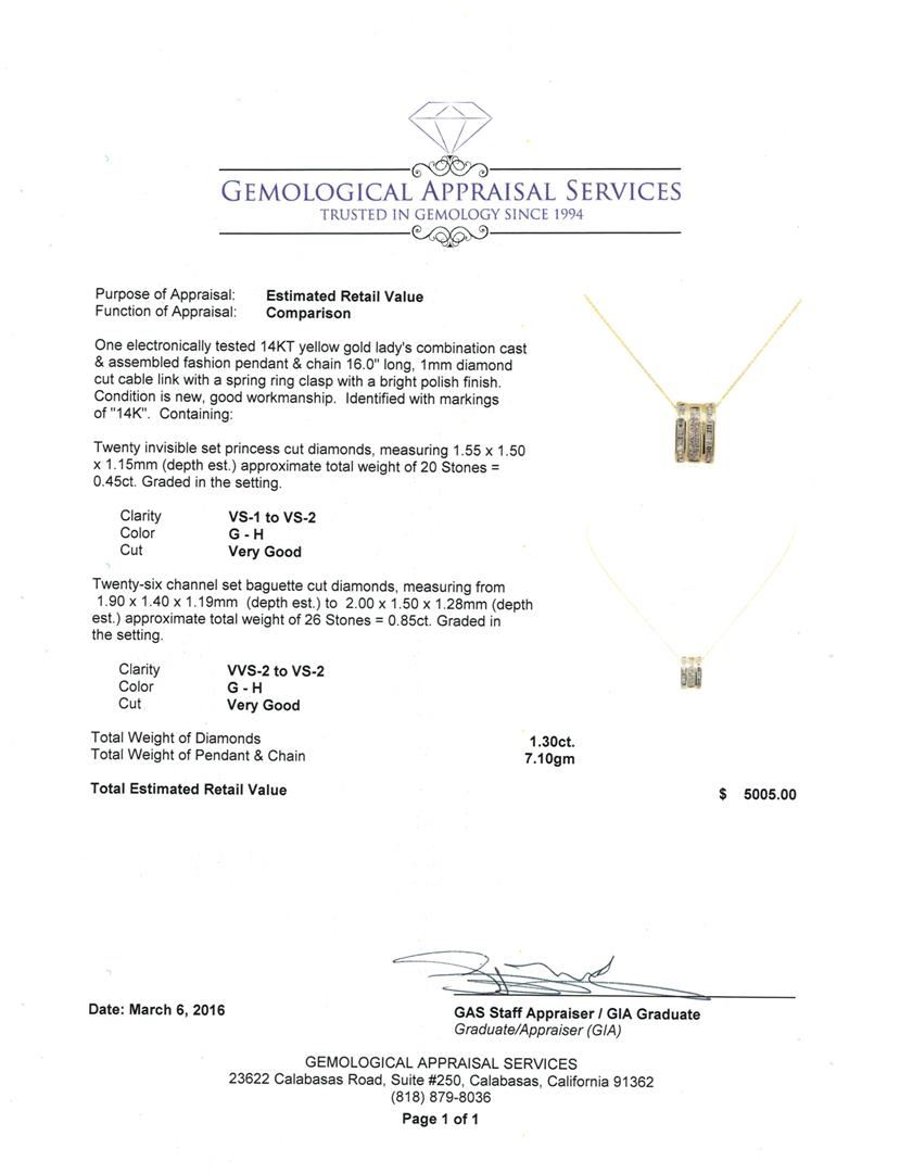 One electronically tested 14KT yellow gold lady's combination cast & assembled fashion pendant & chain 16.0" long, 1mm diamond cut cable link with a spring ring clasp with a bright polish finish. Identified with markings of "14K". Condition is new, good workmanship. Containing: Twenty invisible set princess cut diamonds, measuring 1.55 x 1.50 x 1.15mm (depth est.) approximate. Total Weight of 20 Stones = 0.45ct. Graded in the setting. Clarity: VS-1 to VS-2. Color: G - H, Cut Very Good. Twenty-Six channel set baguette cut diamonds, measuring from 1.90 x 1.40 x 1.19mm (depth est.) to 2.00 x 1.50 x 1.28mm (depth est.) approximate. Total Weight of 26 Stones = 0.85ct. Graded in the setting. Clarity: VVS-2 to VS-2. Color: G - H, Cut Very Good. Total Weight of Diamonds 1.30ct. Total Weight of Pendant & Chain 7.10gm. GAS Appraised at $5,005.00.