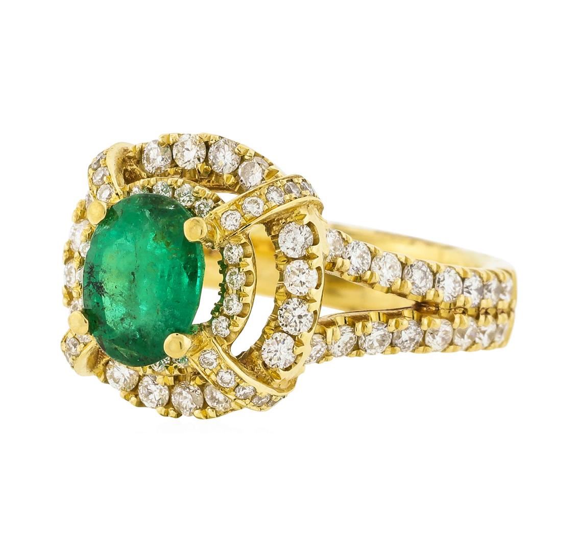 One electronically tested 14KT yellow gold lady's cast fashion ring with a tiered double basket halo with a bright polish finish. The featured lady's ring has a split shank measuring 4.08 millimeters wide. Identified with markings of "14K". Condition is new, good workmanship. Containing: One prong set oval modified mixed cut natural emerald, measuring 7.96 x 6.00 x 4.48mm, (depth est.) 8%. bulge factor, approximate weight of 1.32ct., clarity is heavily included, medium dark, strong, green color, (GIA G 6/5), cut is good. Transmitting light somewhat diffusely, semi-transparent to translucent. Naturally occurring internal & external characteristics are present. Indications of oil residue. Colored gemstones are presumed to have been subjected to commonly used enhancement processes. Graded in the setting. Forty-Eight prong set round brilliant cut diamonds, measuring 1.70 - 1.60 x 1.02mm (depth est.) approximate total weight of 48 Stones = 0.84ct. Graded in the setting. Clarity: SI-1 to SI-2. Color: G - HCut Good Forty-Four prong set round brilliant cut diamonds, measuring 1.05 - 0.95 x 0.61mm (depth est.) approximate total weight of 44 Stones = 0.16ct. Graded in the setting. Clarity: SI-1 to SI-2. Color: H - ICut Good. Total Weight of Colored Stones 1.32ct. Total Weight of Diamonds 1.00ct. Total Weight of Ring 6.60gm. GAS Appraised at $5,350.00.