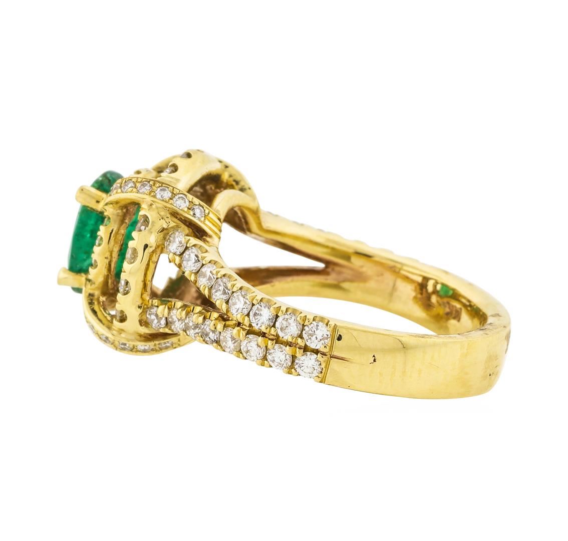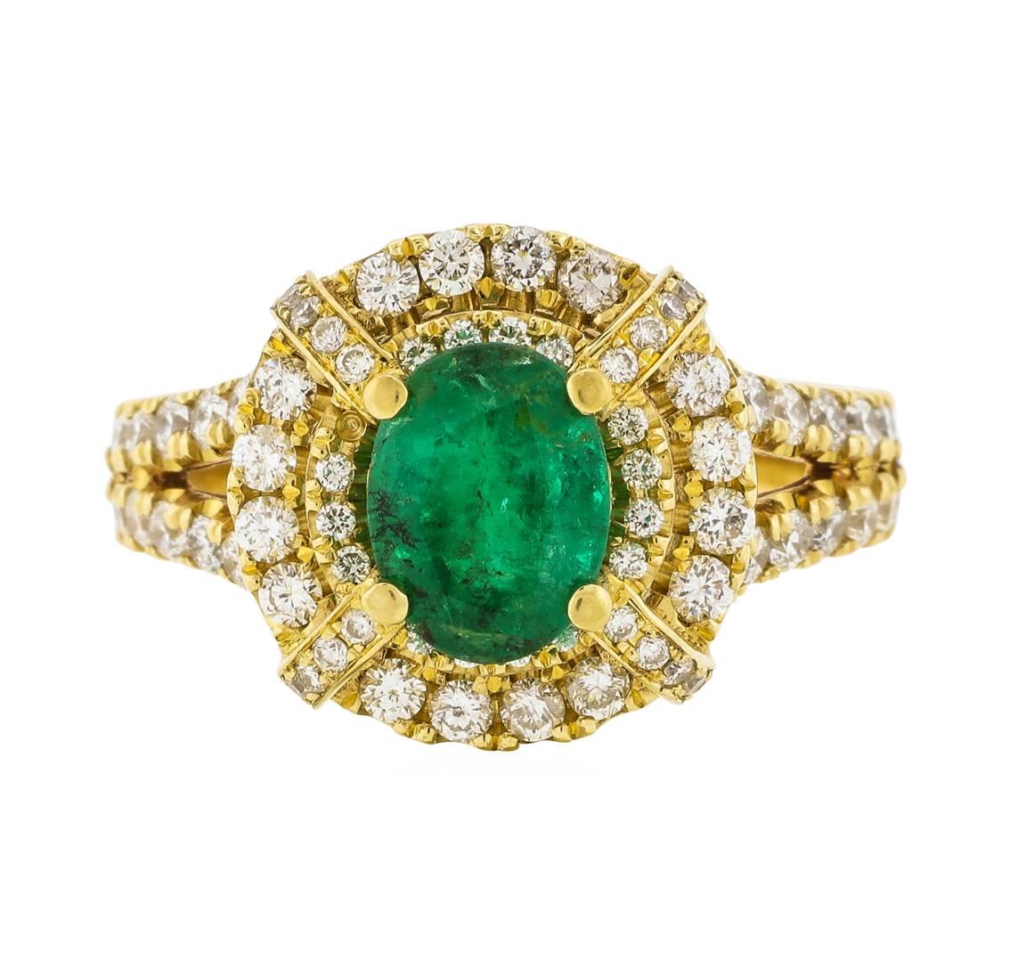 One electronically tested 14KT yellow gold lady's cast fashion ring with a tiered double basket halo with a bright polish finish. The featured lady's ring has a split shank measuring 4.08 millimeters wide. Identified with markings of "14K". Condition is new, good workmanship. Containing: One prong set oval modified mixed cut natural emerald, measuring 7.96 x 6.00 x 4.48mm, (depth est.) 8%. bulge factor, approximate weight of 1.32ct., clarity is heavily included, medium dark, strong, green color, (GIA G 6/5), cut is good. Transmitting light somewhat diffusely, semi-transparent to translucent. Naturally occurring internal & external characteristics are present. Indications of oil residue. Colored gemstones are presumed to have been subjected to commonly used enhancement processes. Graded in the setting. Forty-Eight prong set round brilliant cut diamonds, measuring 1.70 - 1.60 x 1.02mm (depth est.) approximate total weight of 48 Stones = 0.84ct. Graded in the setting. Clarity: SI-1 to SI-2. Color: G - HCut Good Forty-Four prong set round brilliant cut diamonds, measuring 1.05 - 0.95 x 0.61mm (depth est.) approximate total weight of 44 Stones = 0.16ct. Graded in the setting. Clarity: SI-1 to SI-2. Color: H - ICut Good. Total Weight of Colored Stones 1.32ct. Total Weight of Diamonds 1.00ct. Total Weight of Ring 6.60gm. GAS Appraised.