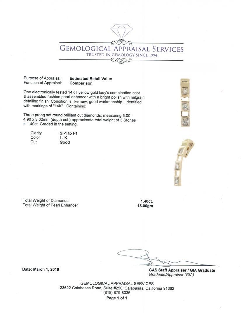 One electronically tested 14KT yellow gold lady's combination cast & assembled fashion pearl enhancer with a bright polish with milgrain detailing finish. Identified with markings of '14K'. Condition is like new, good workmanship. Containing: Three prong set round brilliant cut diamonds, measuring 5.00 - 4.90 x 3.02mm (depth est.) approximate total weight of 3 Stones = 1.40ct. Graded in the setting. Color I - K, Clarity SI-1 to I-1, Cut Good. Total Weight of Diamonds 1.40ct. Total Weight of Pearl Enhancer 18.00gm. GAS Appraised.