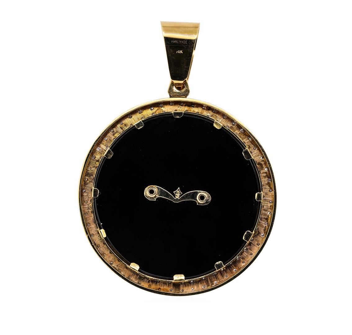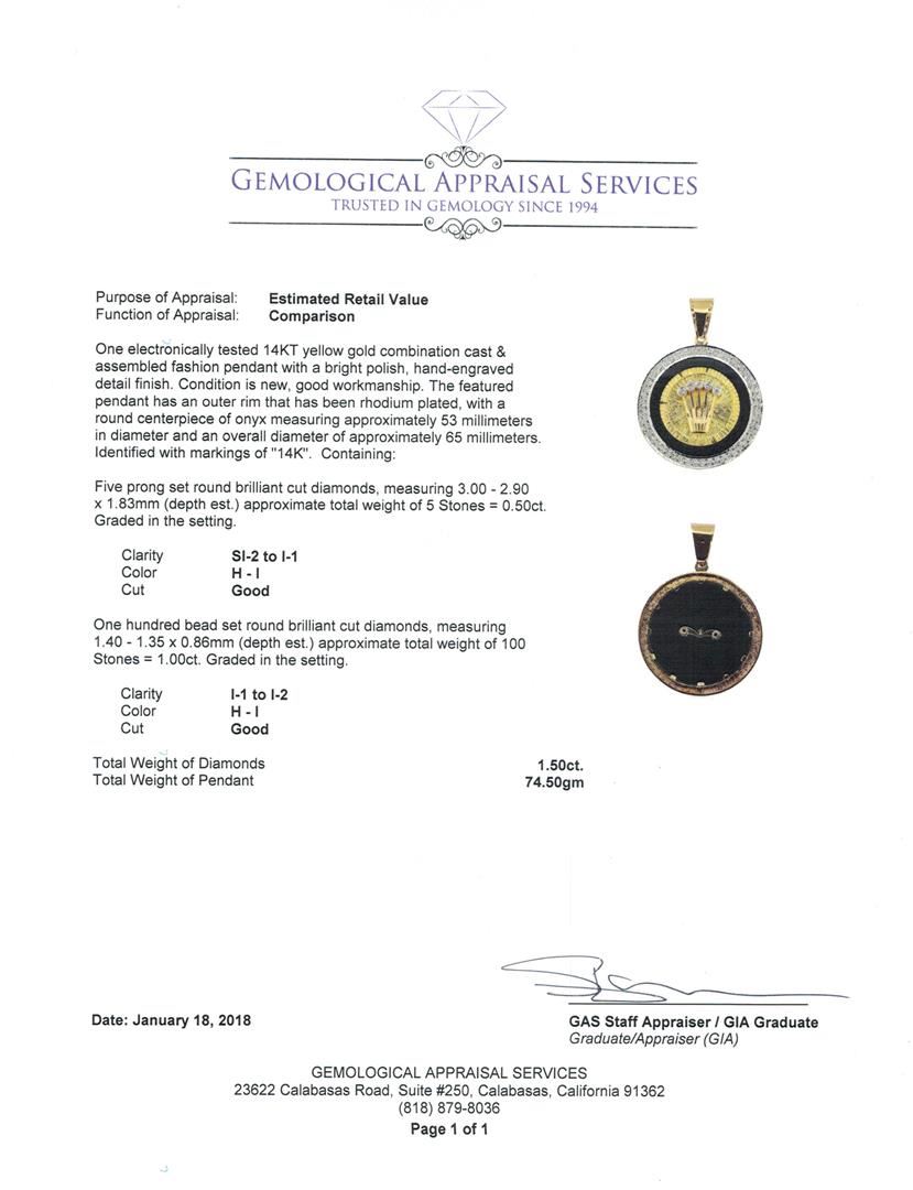 One electronically tested 14KT yellow gold combination cast & assembled fashion pendant with a bright polish, hand-engraved detail finish. The featured pendant has an outer rim that has been rhodium plated, with a round centerpiece of onyx measuring approximately 53 millimeters in diameter and an overall diameter of approximately 65 millimeters. Identified with markings of '14K'. Condition is new, good workmanship. Containing: Five prong set round brilliant cut diamonds, measuring 3.00 - 2.90 x 1.83mm (depth est.) approximate total weight of 5 Stones = 0.50ct. Graded in the setting. Color H - I Clarity SI-2 to I-1 Cut Good One Hundred bead set round brilliant cut diamonds, measuring 1.40 - 1.35 x 0.86mm (depth est.) approximate total weight of 100 Stones = 1.00ct. Graded in the setting. Color H - I Clarity I-1 to I-2 Cut Good. Total Weight of Diamonds 1.50ct. Total Weight of Pendant 74.50gm. GAS Appraised.