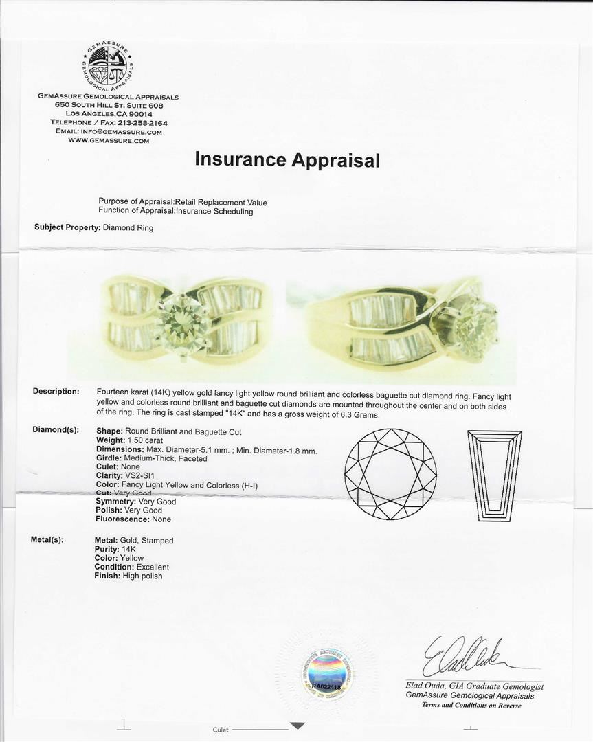 Fourteen karat ( 14K) yellow gold fancy light yellow round brilliant and colorless baguette cut diamond ring. Fancy light yellow and colorless round brilliant and baguette cut diamonds are mounted throughout the center and on sides of the ring with a total approximate weight of 1.50ctw. The ring is cast stamped "14K" and has a gross weight of 6.3 Grams. GGA Appraised.