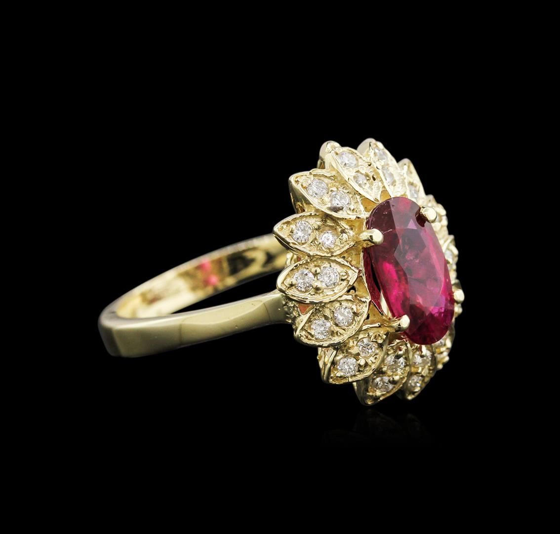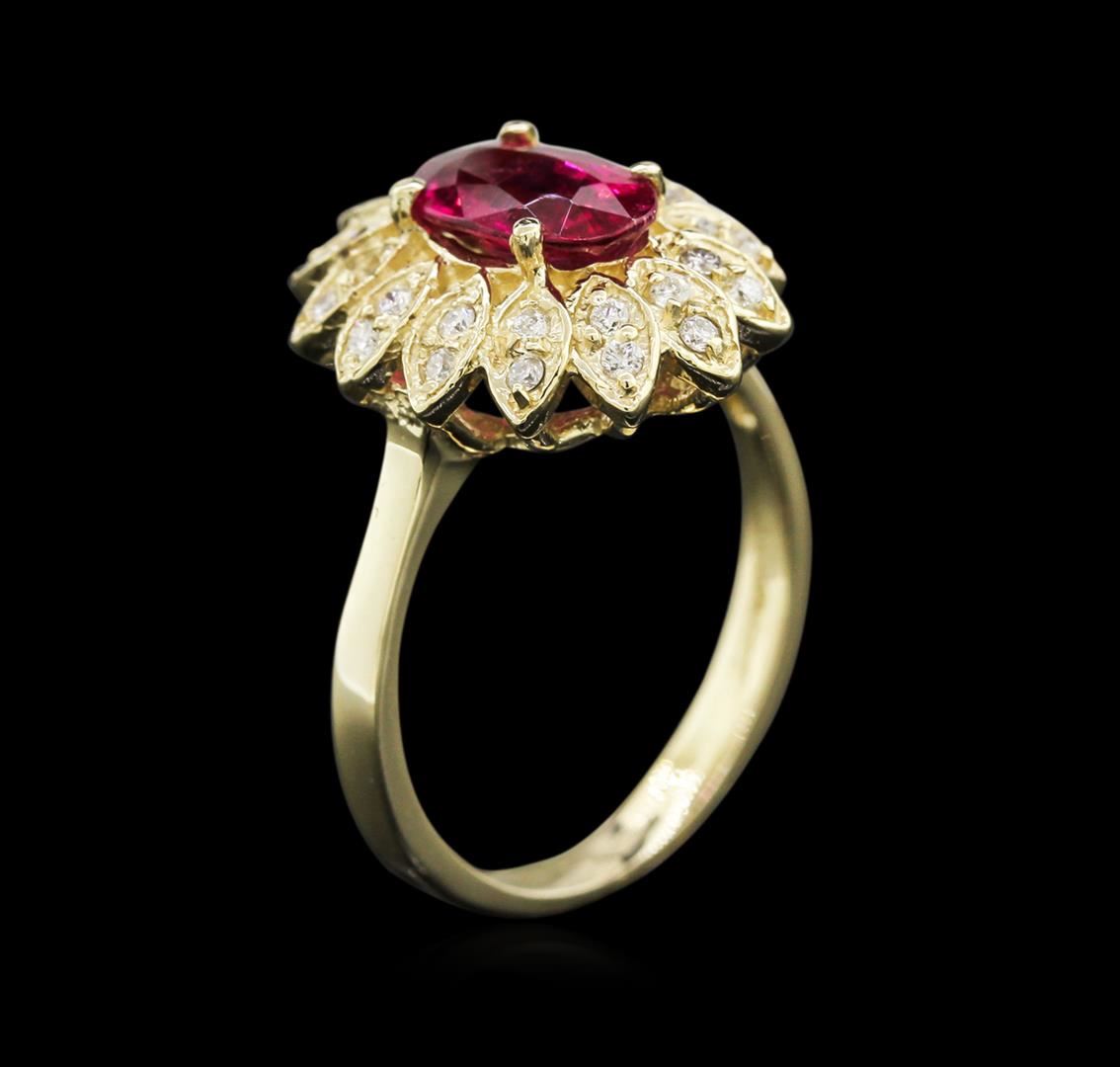 One electronically tested 14KT yellow gold lady's cast flower design ring with a basket setting with a bright polish finish. The featured lady's ring has a 2.75 millimeter wide shank. Identified with markings of "14K". Condition is new, good workmanship. Containing: One prong set oval modified brilliant cut natural pink tourmaline, measuring 9.93 x 5.96 x 3.98mm, 5% bulge factor, approximate weight of 1.58ct., clarity is slightly included, type II, medium, moderately strong, slightly purplish red color, (GIA slpR 5/4), cut is good. Transmitting light with a minimum of distortion, transparent. Naturally occurring internal & external characteristics are present. Colored gemstones are presumed to have been subjected to commonly used enhancement processes. Graded in the setting. Twenty-Eight prong set round brilliant cut diamonds, measuring 1.50 - 1.40 x 0.90mm (depth est.) approximate total weight of 28 Stones = 0.32ct. Graded in the setting. Clarity: SI-2 to I-1. Color: H - I. Cut Good. Total Weight of Colored Stones 1.58ct. Total Weight of Diamonds 0.32ct. Total Weight of Ring 5.20gm. GAS Appraised.