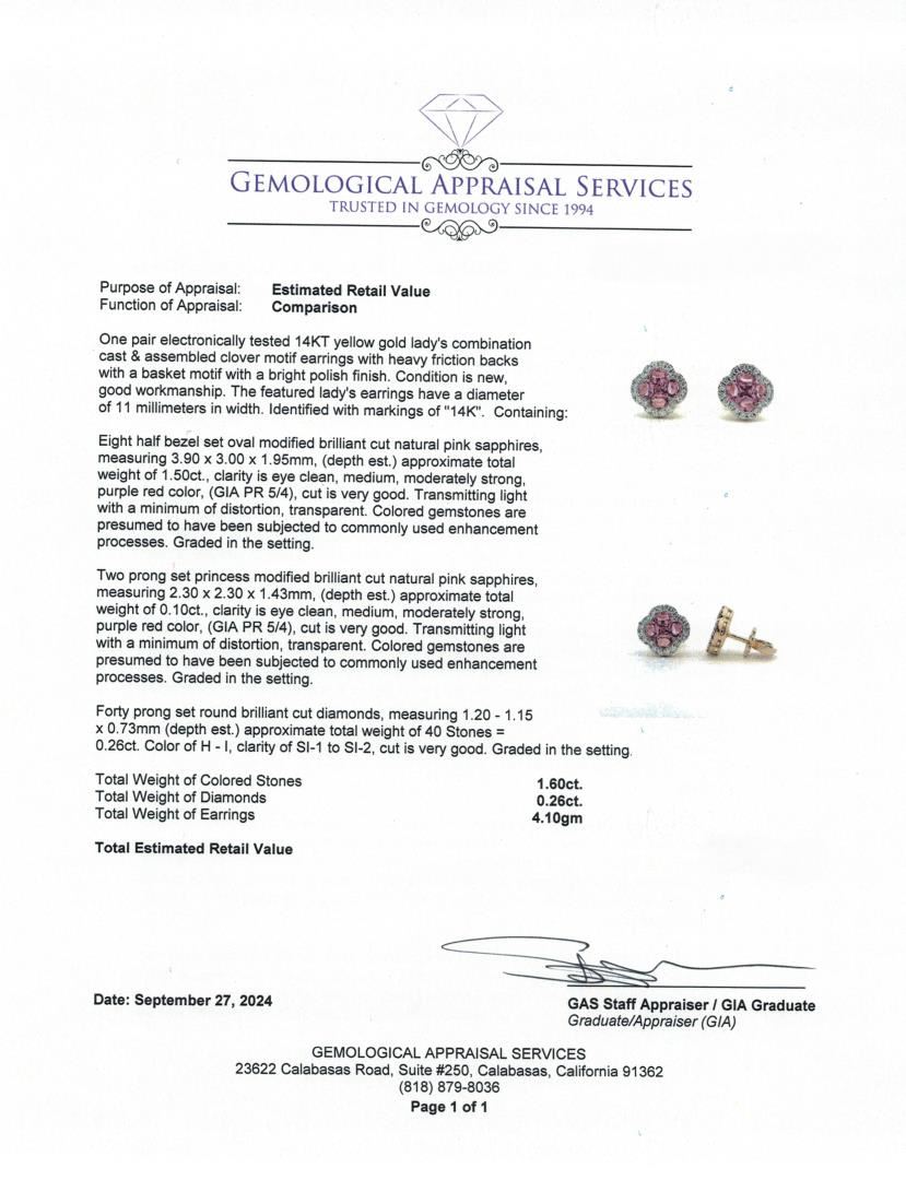 One pair electronically tested 14KT yellow gold lady's combination cast & assembled clover motif earrings with heavy friction backs with a basket motif with a bright polish finish. The featured lady's earrings have a diameter of 11 millimeters in width. Identified with markings of "14K". Condition is new, good workmanship.Containing: Eight half bezel set oval modified brilliant cut natural pink sapphires, measuring 3.90 x 3.00 x 1.95mm, (depth est.) approximate total weight of 1.50ct., clarity is eye clean, medium, moderately strong, purple red color, (GIA PR 5/4), cut is very good. Transmitting light with a minimum of distortion, transparent. Colored gemstones are presumed to have been subjected to commonly used enhancement processes. Graded in the setting. Two prong set princess modified brilliant cut natural pink sapphires, measuring 2.30 x 2.30 x 1.43mm, (depth est.) approximate total weight of 0.10ct., clarity is eye clean, medium, moderately strong, purple red color, (GIA PR 5/4), cut is very good. Transmitting light with a minimum of distortion, transparent. Colored gemstones are presumed to have been subjected to commonly used enhancement processes. Graded in the setting. Forty prong set round brilliant cut diamonds, measuring 1.20 - 1.15 x 0.73mm (depth est.) approximate total weight of 40 Stones = 0.26ct. Graded in the setting. Color: H - I. Clarity: SI-1 to SI-2. Cut: Very Good. Total Weight of Colored Stones: 1.60ct. Total Weight of Diamonds: 0.26ct. Total Weight of Earrings: 4.10gm. Appraised by Gemological Appraisal Services. GAS Appraised.