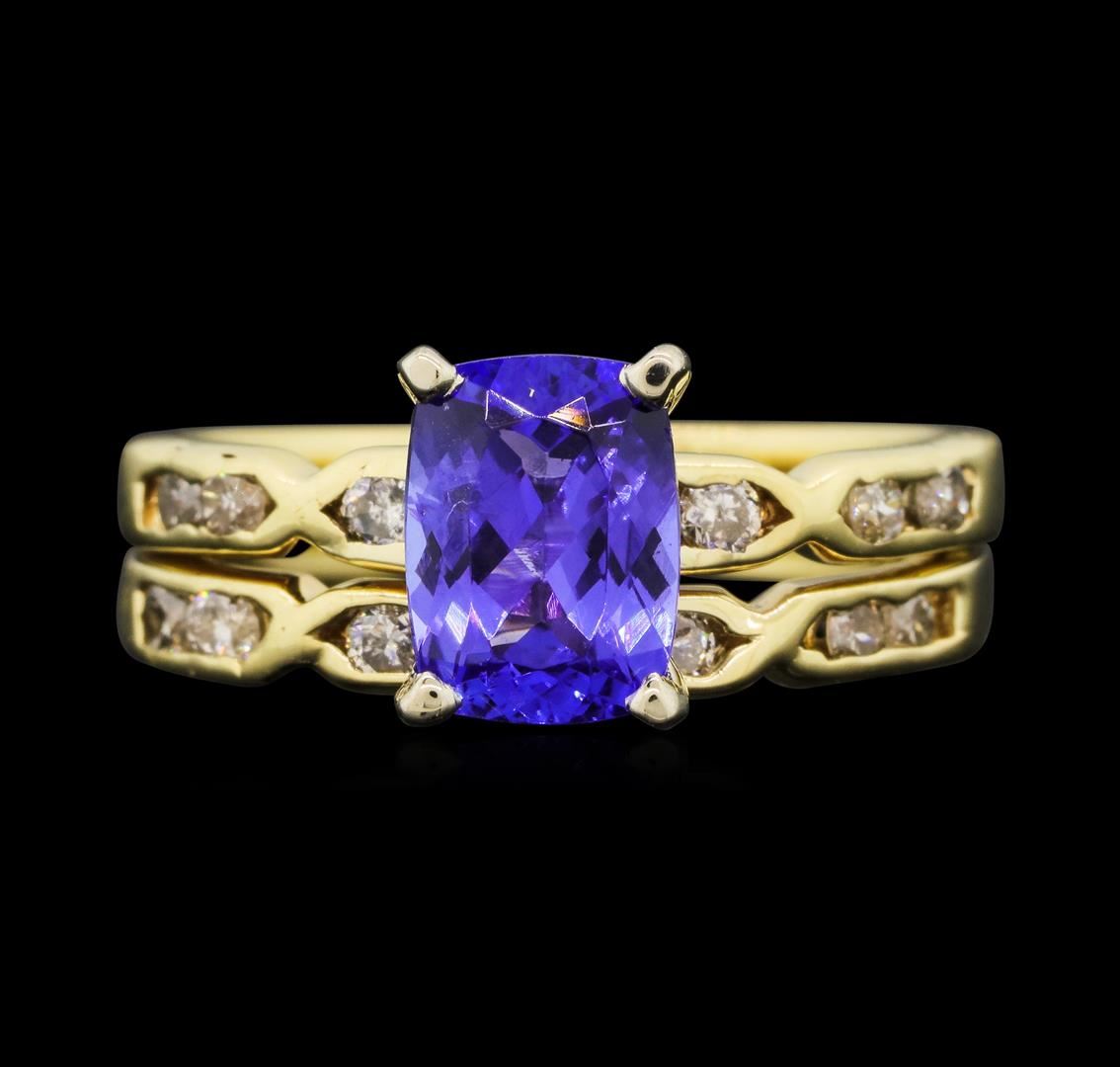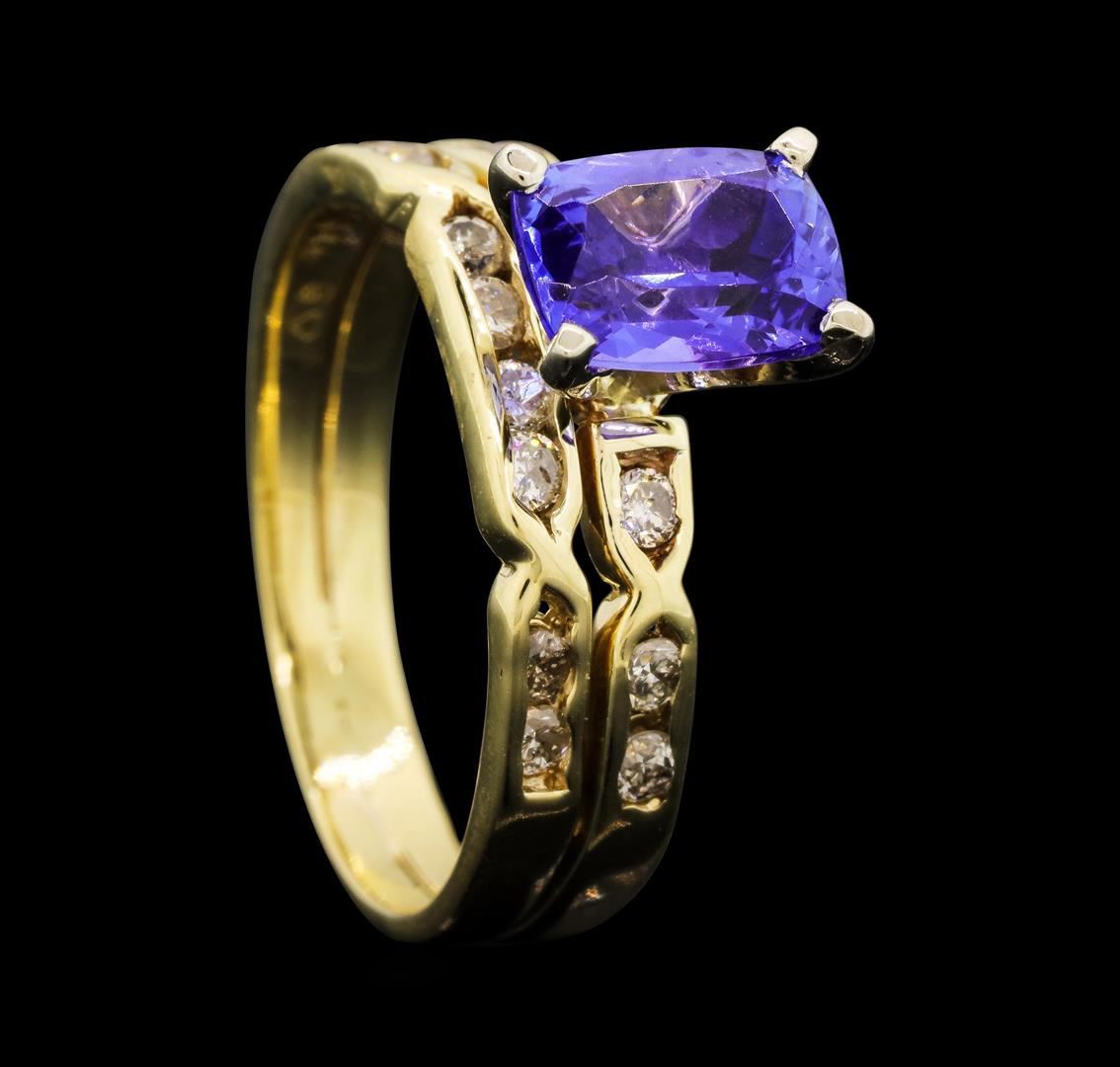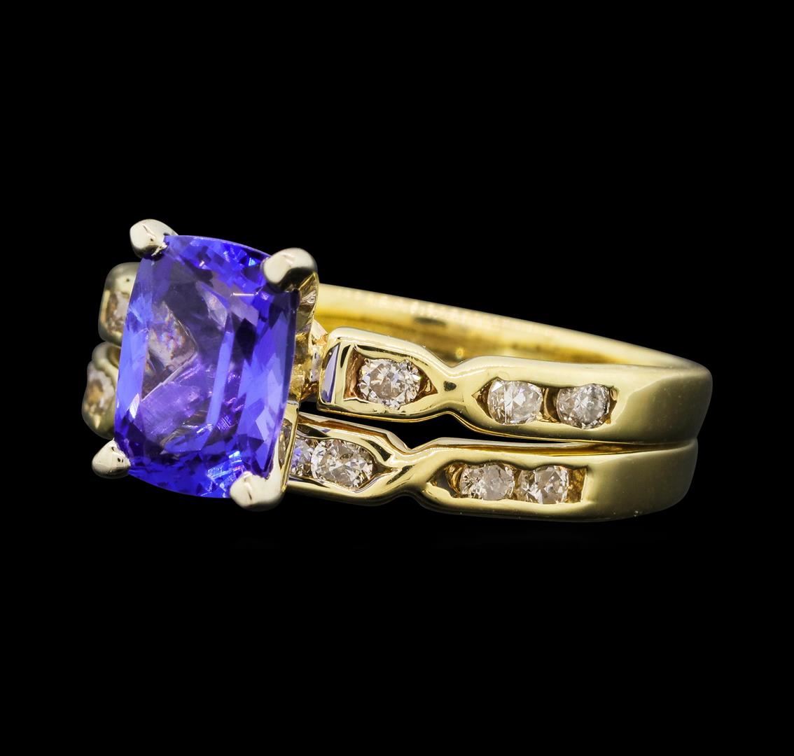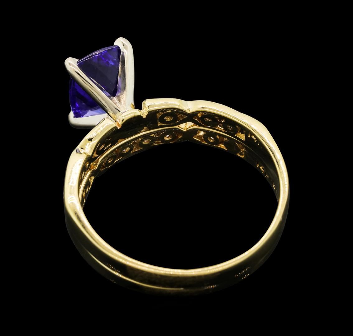 One electronically tested 14KT yellow gold lady's combination cast & assembled fashion ring with a double split shank with a bright polish finish. The featured lady's ring has a double shank measuring 3.41 millimeters wide. Identified with markings of "14K". Condition is like new, good workmanship. Containing: One prong set rectangular cushion modified brilliant cut natural tanzanite, measuring 8.13 x 6.07 x 4.25mm, (depth est.) approximate weight of 1.64ct., clarity is slightly included, medium dark, moderately strong, violetish blue color, (GIA vB 6/4), cut is very good. Transmitting light with a minimum of distortion, transparent. Colored gemstones are presumed to have been subjected to commonly used enhancement processes. Graded in the setting. Fourteen channel set round brilliant cut diamonds, measuring 2.00 - 1.90 x 1.21mm (depth est.) approximate. Total Weight of 14 Stones = 0.40ct. Graded in the setting. Color J - K Clarity SI-2 to I-1 Cut Good. Total Weight of Colored Stones 1.64ct.. Total Weight of Diamonds 0.40ct.. Total Weight of Ring 4.10gm. GAS Appraised.