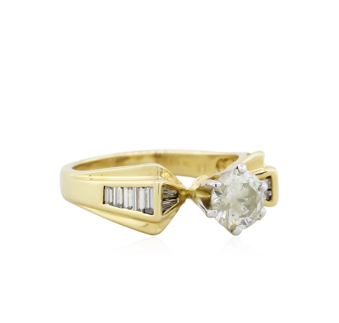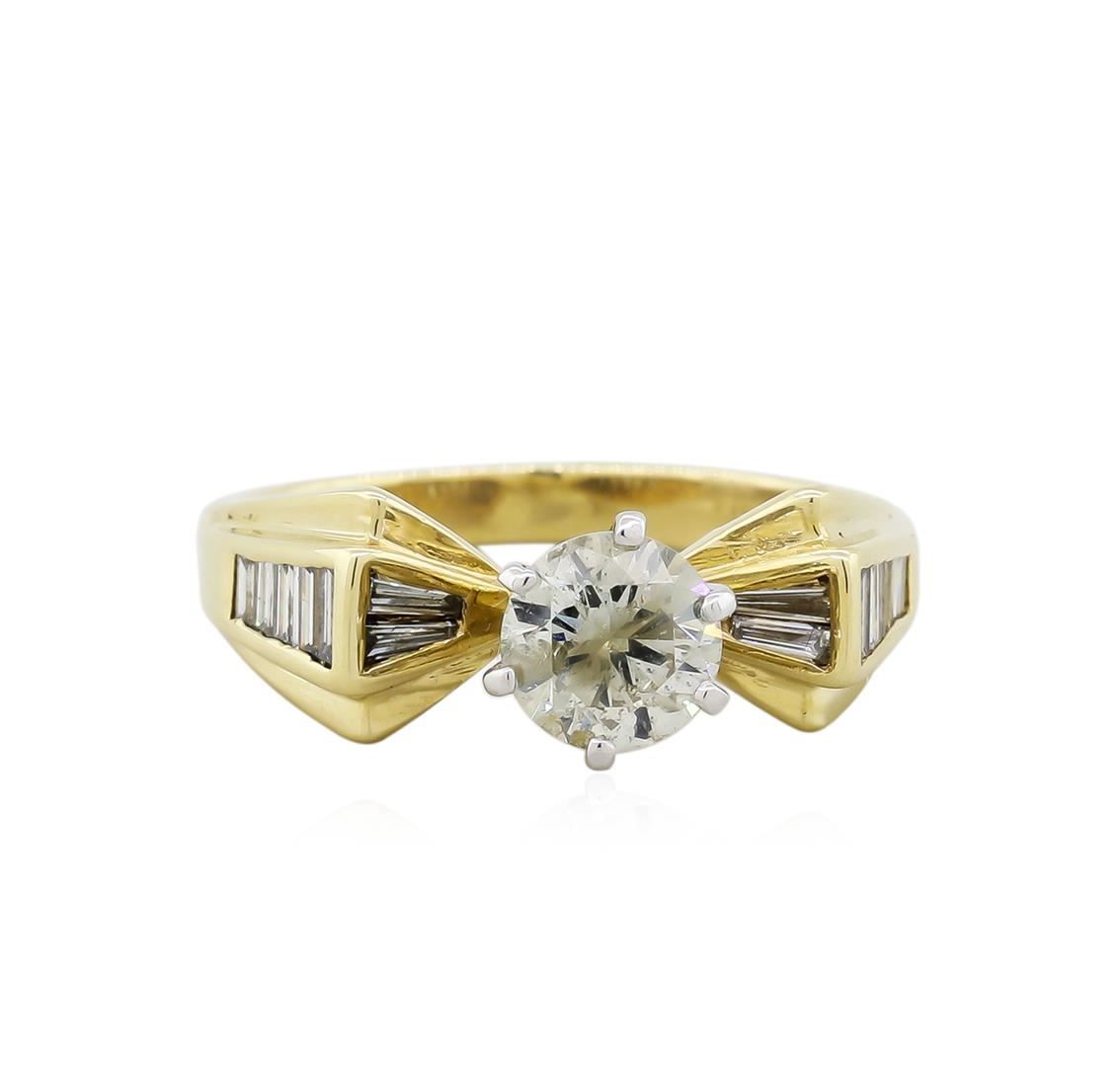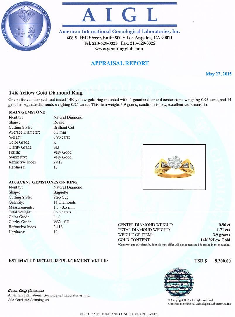 One polished, stamped and tested 18KT white gold ladies cast diamond unity ring with bright polish finish. Condition is new, good workmanship. 1 genuine brilliant cut diamond round center stone weighing 0.86 carats and 14 genuine baguette diamonds weighing 0.75 carats. The centerstone color is K, clarity is SI3. Baguette diamonds clarity ranges from VS2-SI1, color I-J. This item weighs 3.9 grams, condition is new and workmanship is excellent. AIGL Appraised at $8,200.00.