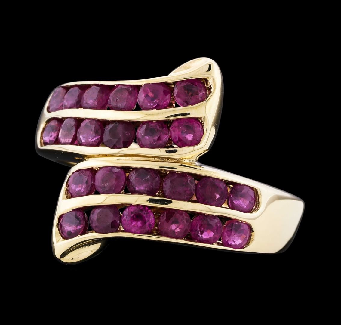 One electronically tested 14KT yellow gold lady's cast fashion ring with a bypass shank with a bright polish finish. The featured lady's ring has a shank measuring 2.63 millimeters wide. Identified with markings of "14KP". Condition is new, good workmanship. Containing: Twenty-four channel set round modified brilliant cut natural rubies, measuring 2.40 - 2.30 x 1.53 mm, (depth est.) approximate total weight of 1.80ct., clarity is heavily included, medium, moderately strong, slightly purplish red color, (GIA slpR 5/4), cut is good. Transmitting light somewhat diffusely, semi-transparent to translucent. Naturally occurring internal & external characteristics are present. Indications of laboratory high temperature heat treatment. Colored gemstones are presumed to have been subjected to commonly used enhancement processes. Graded in the setting. Total Weight of Colored Stones 1.80ct. Total Weight of Ring 3.40gm. GAS Appraised.