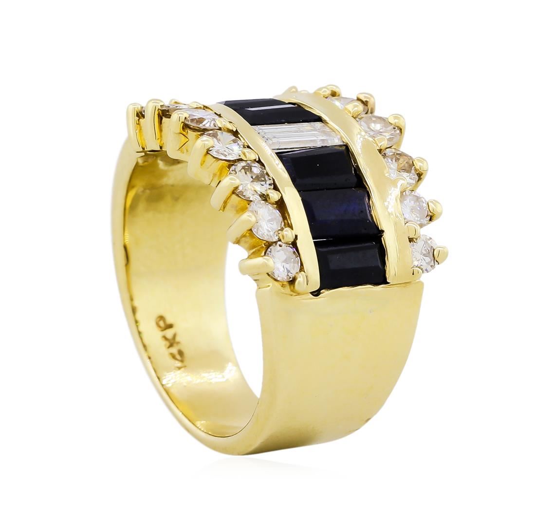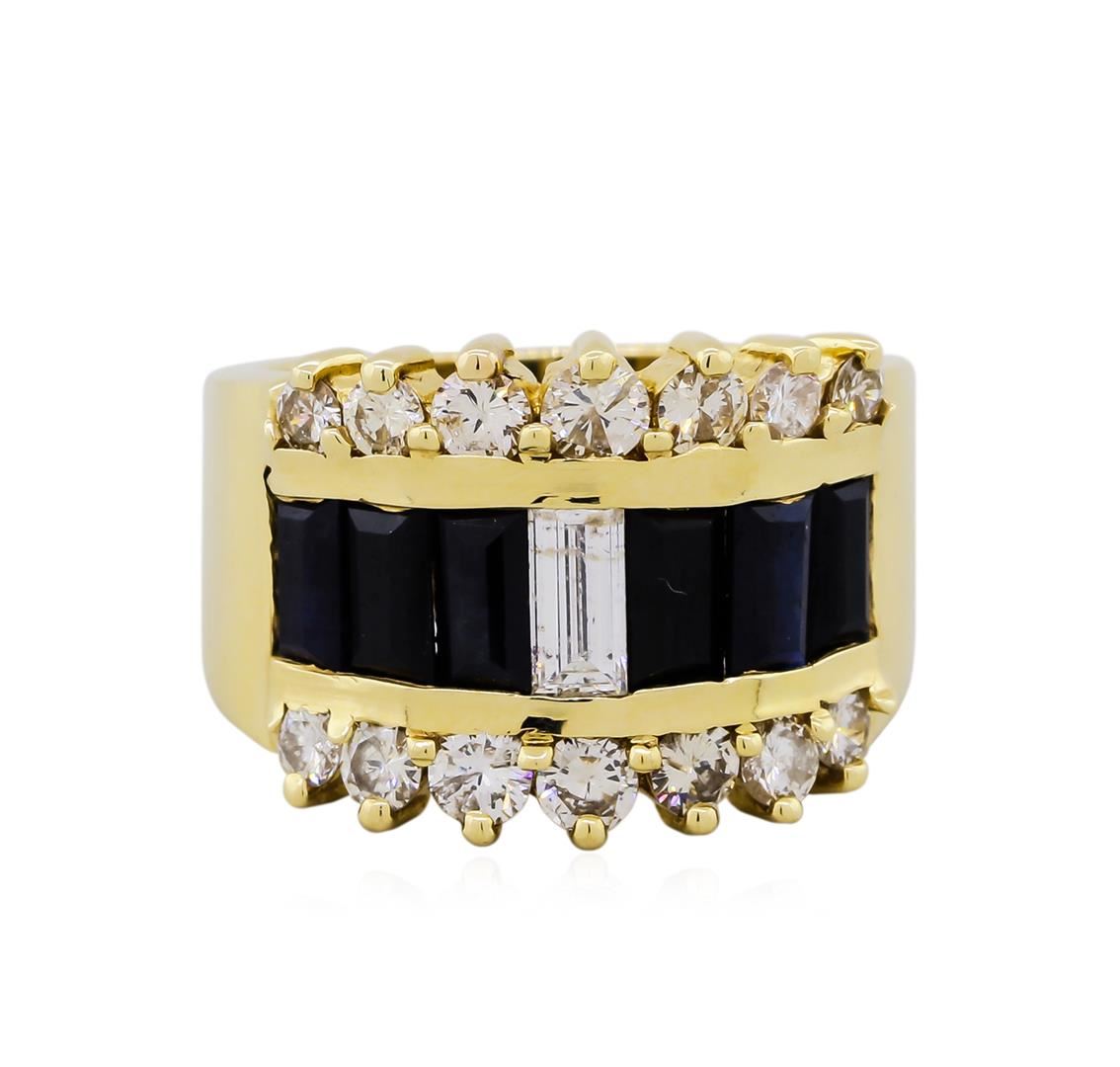 One electronically tested 14KT yellow gold ladies cast sapphire and diamond ring. The ring features a row of diamond and sapphire channel set baguettes supported by a curvature of prong set round brilliant diamonds, completed by a six millimeter wide tapered band. Identified with markings of "14KP". Condition is new, good workmanship. Containing: Six channel set rectangular step cut natural blue sapphires, measuring 5.30 x 2.70 x 1.76mm, approximate. Total Weight of 1.80ct., clarity is moderately included, type II, dark, very slightly grayish, very slightly greenish blue color, (GIA vslgB 7/3), cut is good. Transmitting light with a minimum of distortion, transparent. Naturally occurring internal & external characteristics are present. Graded in the setting.One channel set baguette cut diamond, measuring 5.60 x 2.80 x 2.38mm (depth est.) approximate weight of 0.34ct. Graded in the setting. Clarity: I-1. Color: G Fourteen prong set round brilliant cut diamonds, measuring 3.00 - 2.30 x 1.59mm (depth est.) approximate. Total Weight of 14 Stones = 0.95ct. Graded in the setting. Clarity: SI-1 to SI-2. Color: G - I. Total Weight of Colored Stones 1.80ct. Total Weight of Diamonds 1.29ct. AIG Appraised at $7,300.00.