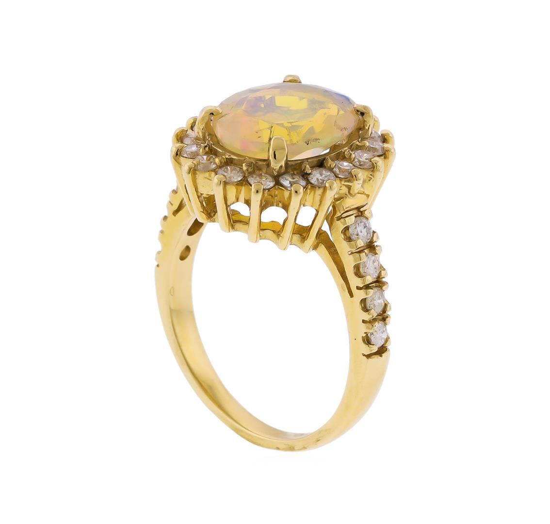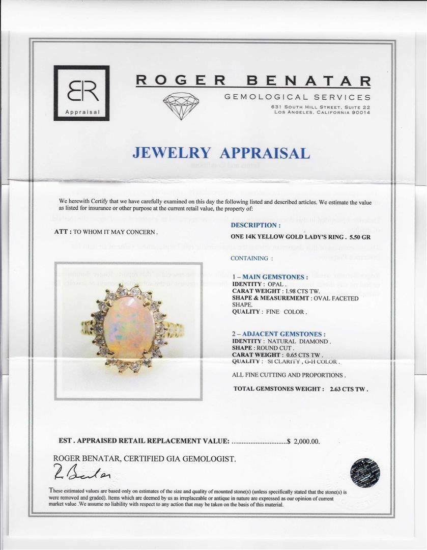 Containing 14KT Yellow Gold Ring weighing approximately 5.50 grams. (1) Oval Shaped opal weighing approximately 1.98cts; Surrounded by diamonds weighing approximately 0.65ctw, Clarity: SI Clarity, Color: G-H. RBGS Appraised at $2,000.00.
