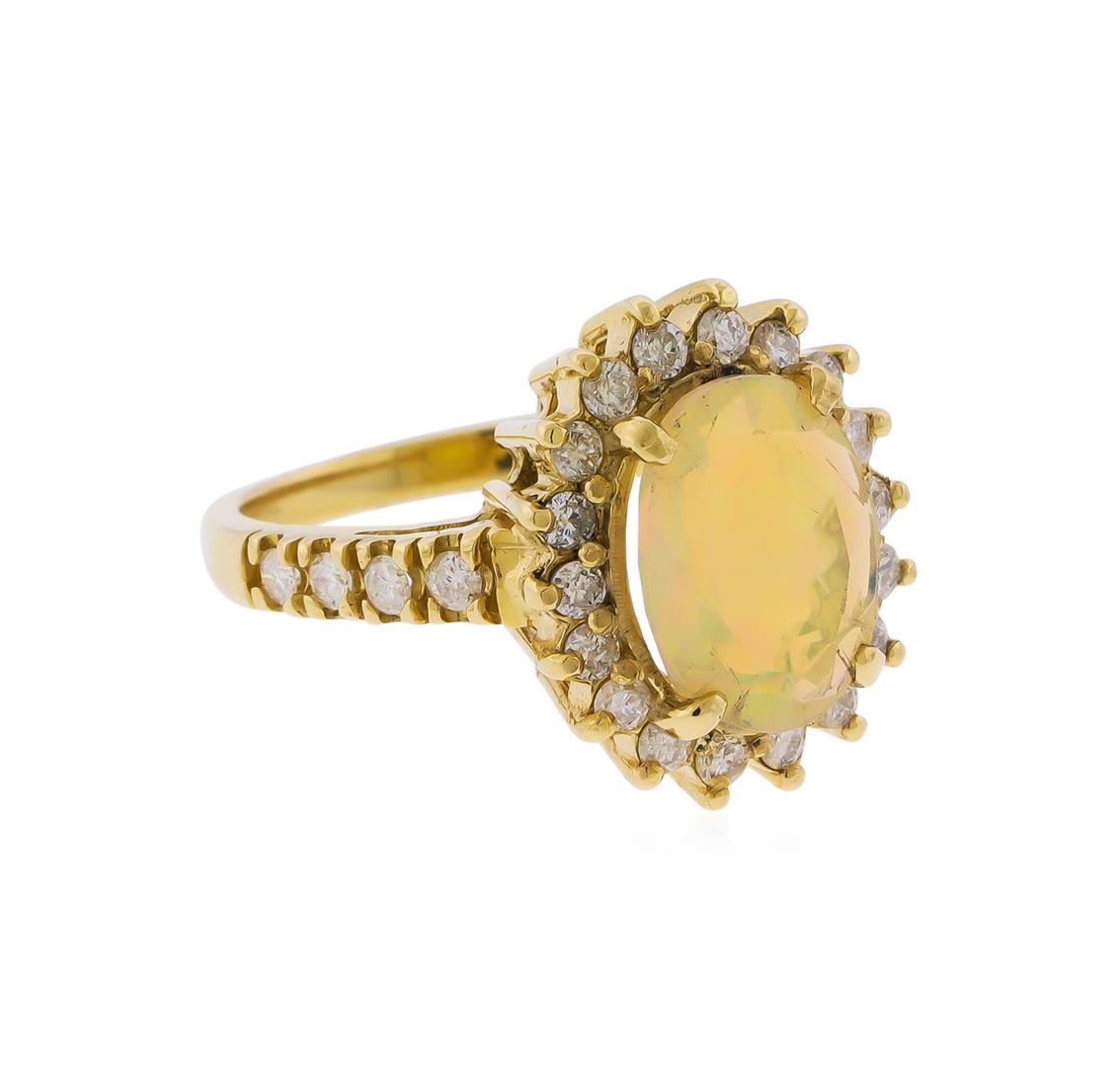 Containing 14KT Yellow Gold Ring weighing approximately 5.50 grams. (1) Oval Shaped opal weighing approximately 1.98cts; Surrounded by diamonds weighing approximately 0.65ctw, Clarity: SI Clarity, Color: G-H. RBGS Appraised at $2,000.00.