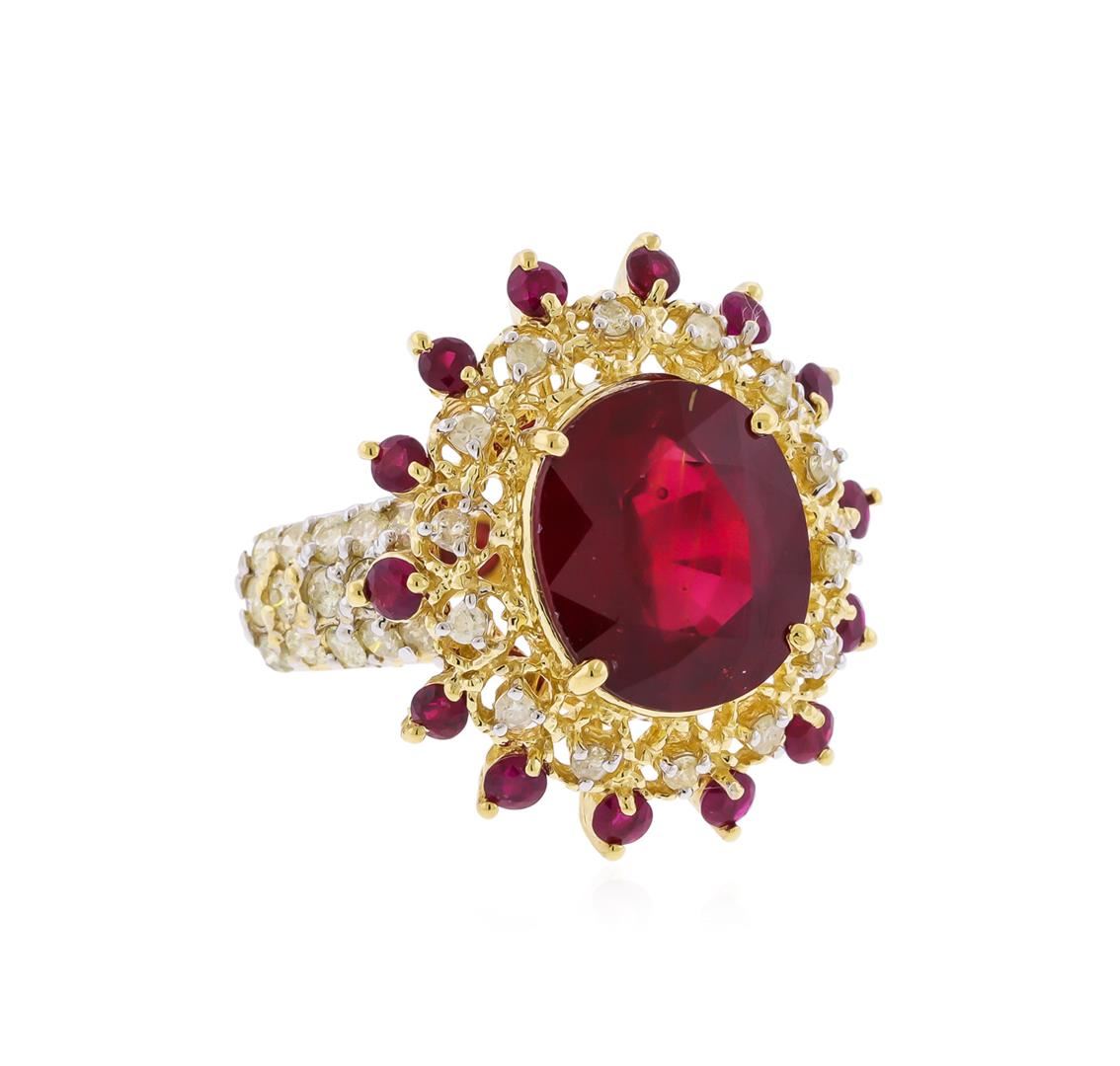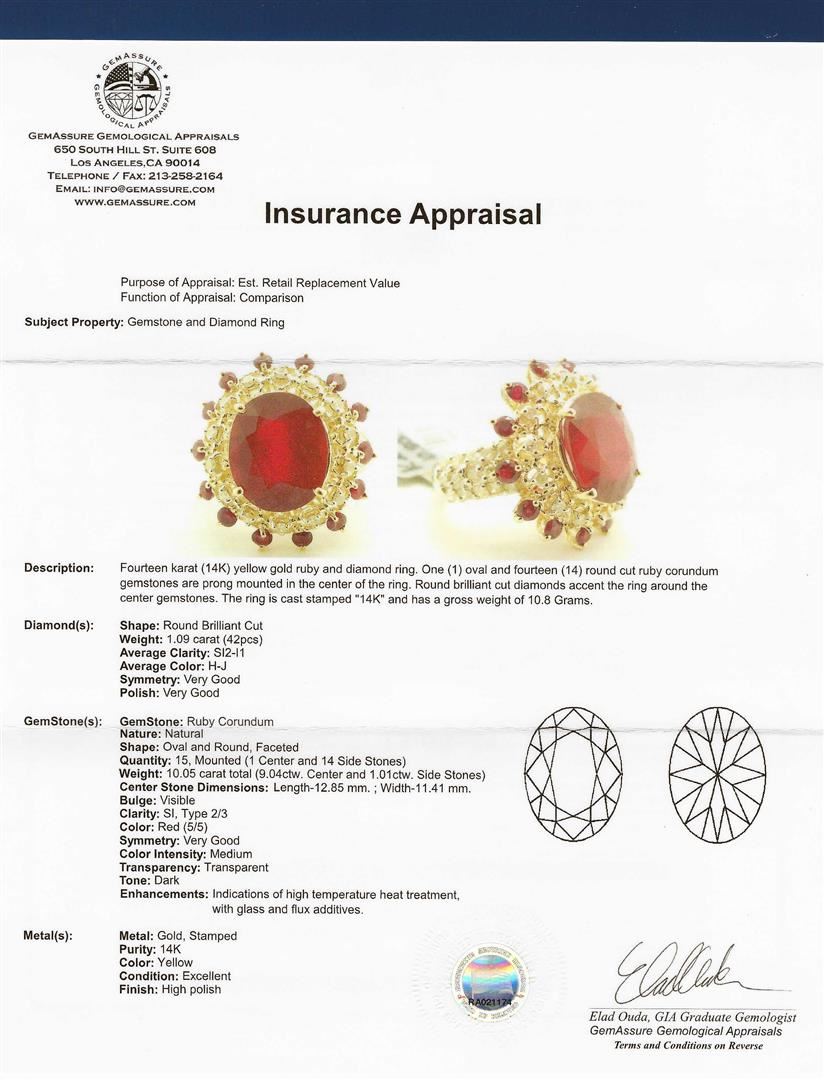 One fourteen karat (14KT) yellow gold ruby and diamond ring. One oval and fourteen round cut ruby corundum gemstones are prong mounted in the center of the ring. Round brilliant cut diamonds, average clarity SI2-I1, average color H-J, weighing 1.09 carats, accent the ring around the center gemstone. The ring is cast stamped "14K" and has a gross weight of 10.8 Grams. GGA Appraised.