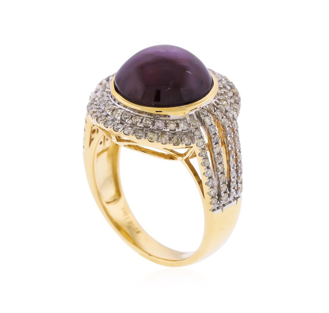 One electronically tested 14KT yellow gold ladies cast star ruby and diamond ring. The featured star ruby is set within tiered diamond bezel supported by diamond set four-way split shoulders, completed by a three millimeter wide band. Bright polish finish with rhodium accents. Trademark is Orianne. Identified with markings of "14K". Condition is new, good workmanship. Containing: One bezel set oval cabochon cut natural star ruby approximate weight of 10.10ct., dark, very slightly brownish, strongly purplish red color, (GIA stpR 7/3), cut is good. This stone has a complete six ray star with strong intensity and good movement. Transmitting light very diffusely, opaque. Naturally occurring internal & external characteristics arepresent. No indications of heating. Graded in the setting. Ruby has a low tolerance torhodium plating, repolishing the surface, & ultrasonic cleaning.One Hundred Thirty prong set round brilliant cut diamonds approximate total weight of 130 Stones = 0.84ct. Graded in the setting. Clarity: I-1 to I-3. Color: I - K. Total Weight of Colored Stones 10.10ct. Total Weight of Diamonds 0.84ct. Total Weight of Ring 8.94gm. AIG Appraised at $4,205.00.
