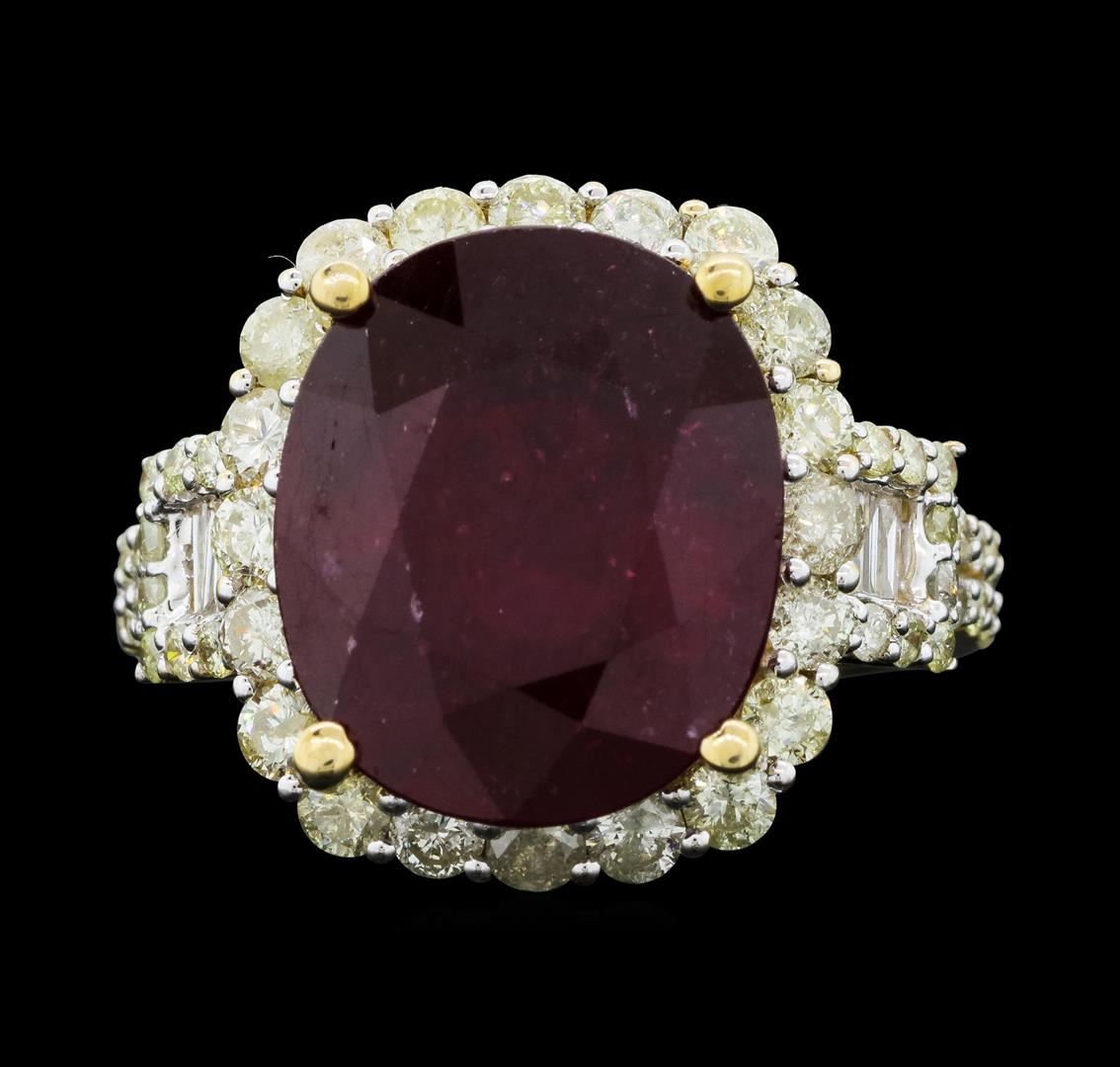 One electronically tested 14KT yellow gold ladies cast ruby and diamond ring. The featured ruby is set within a diamond bezel supported by elaborate diamond set shoulders, completed by a two and one-half millimeter wide band. Trademark is Orianne. Identified with markings of "14K". Condition is new, good workmanship. Containing: One prong set oval mixed cut natural ruby approximate weight of 10.24ct., clarity is heavily included, type II, dark, very slightly brownish, slightly purplish red color, (GIA slpR 7/3), cut is good. Transmitting light somewhat diffusely, transparent to translucent. Naturally occurring internal & external characteristics are present. Indications of laboratory high temperature heat treatment, with glass & flux additives. Graded in the setting. Ruby has a low tolerance to rhodium plating, repolishing the surface, & ultrasonic cleaning. Fifty-Two prong set round brilliant cut diamonds approximate total weight of 52 Stones = 1.56ct. The group is composed of a mix of natural faint yellow and very light yellow color diamonds. Graded in the setting. Clarity: I-1 to I-2 Eight channel set baguette cut diamonds, measuring from 2.90 x 0.90 x 0.63mm (depth est.) to 3.15 x 1.00 x 0.70mm (depth est.) approximate total weight of 8 Stones = 0.14ct. Graded in the setting. Clarity: VS-2 to SI-2. Color: G - H. Total Weight of Colored Stones 10.24ct. Total Weight of Diamonds 1.70ct. Total Weight of Ring 7.35gm. AIG Appraised.