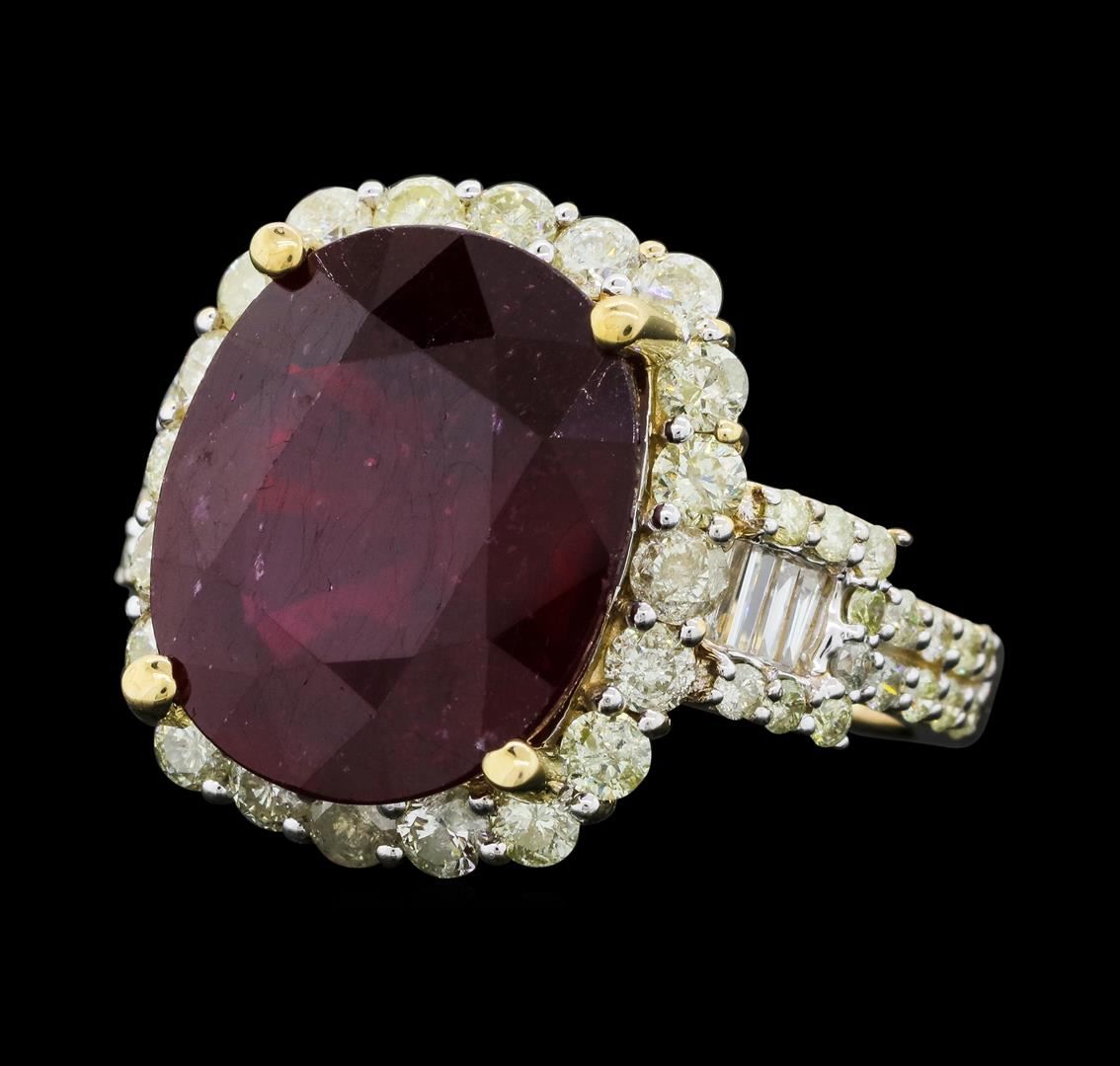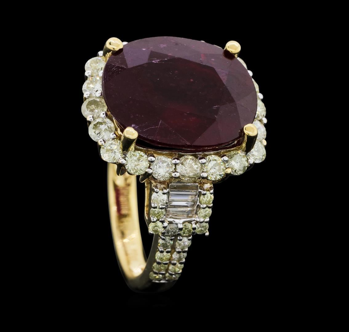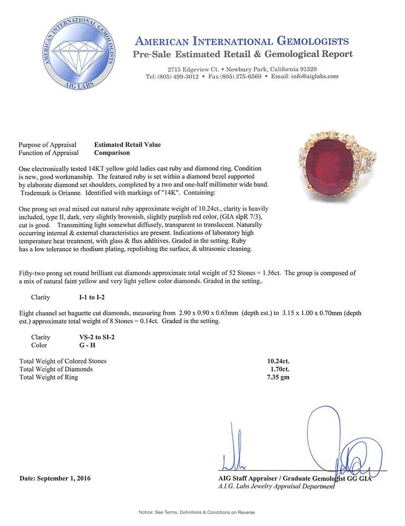One electronically tested 14KT yellow gold ladies cast ruby and diamond ring. The featured ruby is set within a diamond bezel supported by elaborate diamond set shoulders, completed by a two and one-half millimeter wide band. Trademark is Orianne. Identified with markings of "14K". Condition is new, good workmanship. Containing: One prong set oval mixed cut natural ruby approximate weight of 10.24ct., clarity is heavily included, type II, dark, very slightly brownish, slightly purplish red color, (GIA slpR 7/3), cut is good. Transmitting light somewhat diffusely, transparent to translucent. Naturally occurring internal & external characteristics are present. Indications of laboratory high temperature heat treatment, with glass & flux additives. Graded in the setting. Ruby has a low tolerance to rhodium plating, repolishing the surface, & ultrasonic cleaning. Fifty-Two prong set round brilliant cut diamonds approximate total weight of 52 Stones = 1.56ct. The group is composed of a mix of natural faint yellow and very light yellow color diamonds. Graded in the setting. Clarity: I-1 to I-2 Eight channel set baguette cut diamonds, measuring from 2.90 x 0.90 x 0.63mm (depth est.) to 3.15 x 1.00 x 0.70mm (depth est.) approximate total weight of 8 Stones = 0.14ct. Graded in the setting. Clarity: VS-2 to SI-2. Color: G - H. Total Weight of Colored Stones 10.24ct. Total Weight of Diamonds 1.70ct. Total Weight of Ring 7.35gm. AIG Appraised.