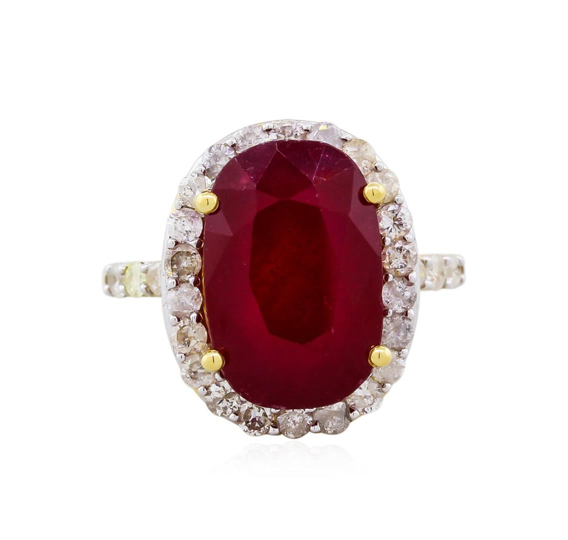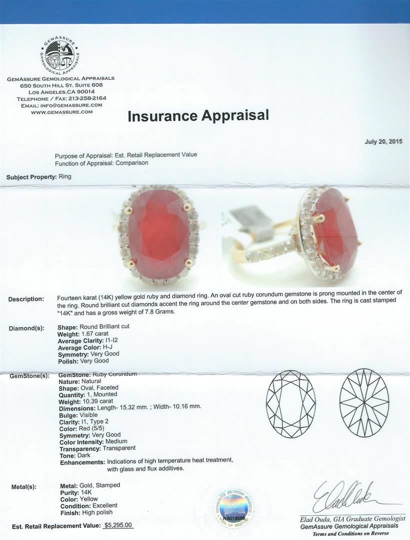 14KT yellow gold ruby and diamond ring. An oval cut ruby corunduml gemstone weighing in at an aproximate 10.39 carats is prong mounted in the center of the ring. Approximately 1.67 carats of round brilliant cut diamonds accent the ring around the center gemstones and on both sides. The ring are cast stamped "14K" and have a gross weight of 7.8 grams. Finish: High polish. Condition: Excellent GGA Appraised at $5,295.00.