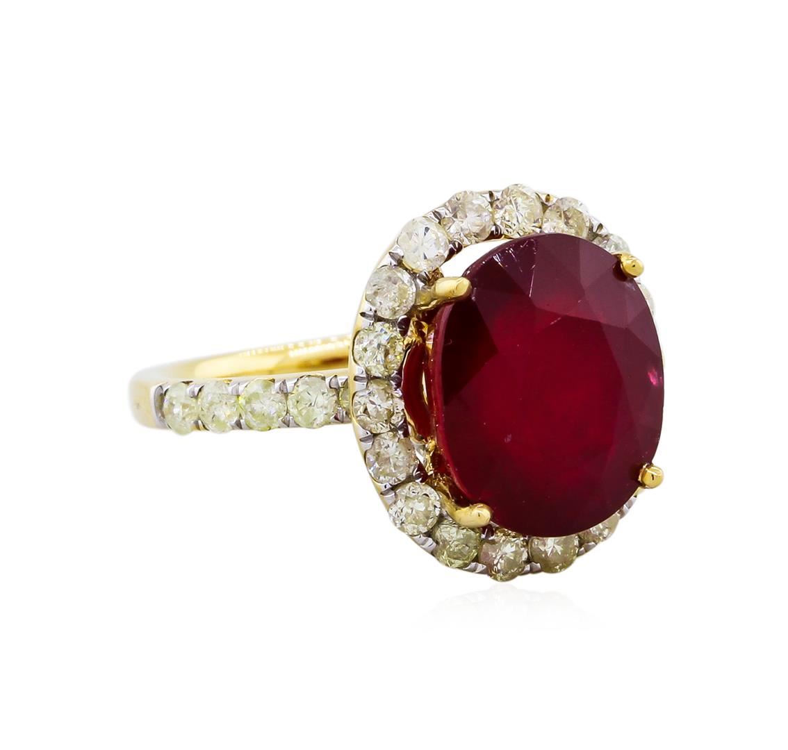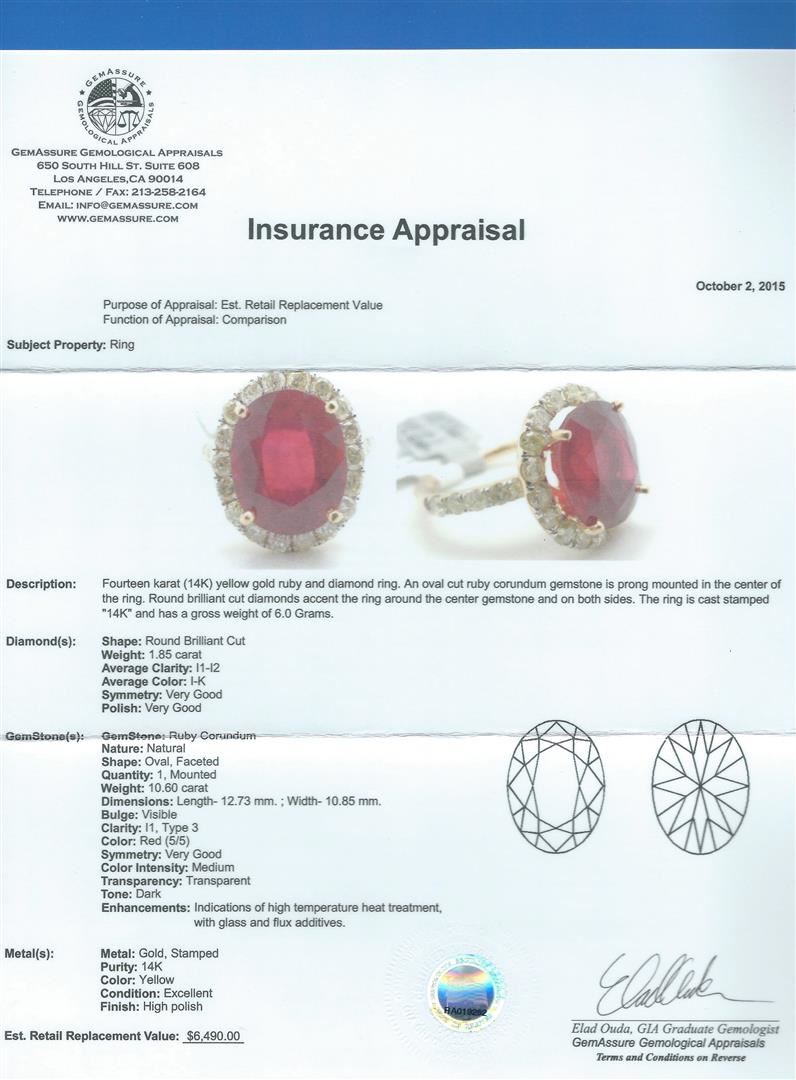 14KT yellow gold ruby and diamond ring. An oval cut ruby corundum gemstone weighing in at an aproximate 10.60 carats is prong mounted in the center of the ring. Approximately 1.85 carats of round brilliant cut diamonds accent the ring around the center gemstones and on both sides. The ring is cast stamped "14K" and has a gross weight of 6.0 grams. The diamond have an average clarity of I1-I2. Ruby color red, intensity is medium. Finish: High polish. Condition: Excellent GGA Appraised at $6,490.00.