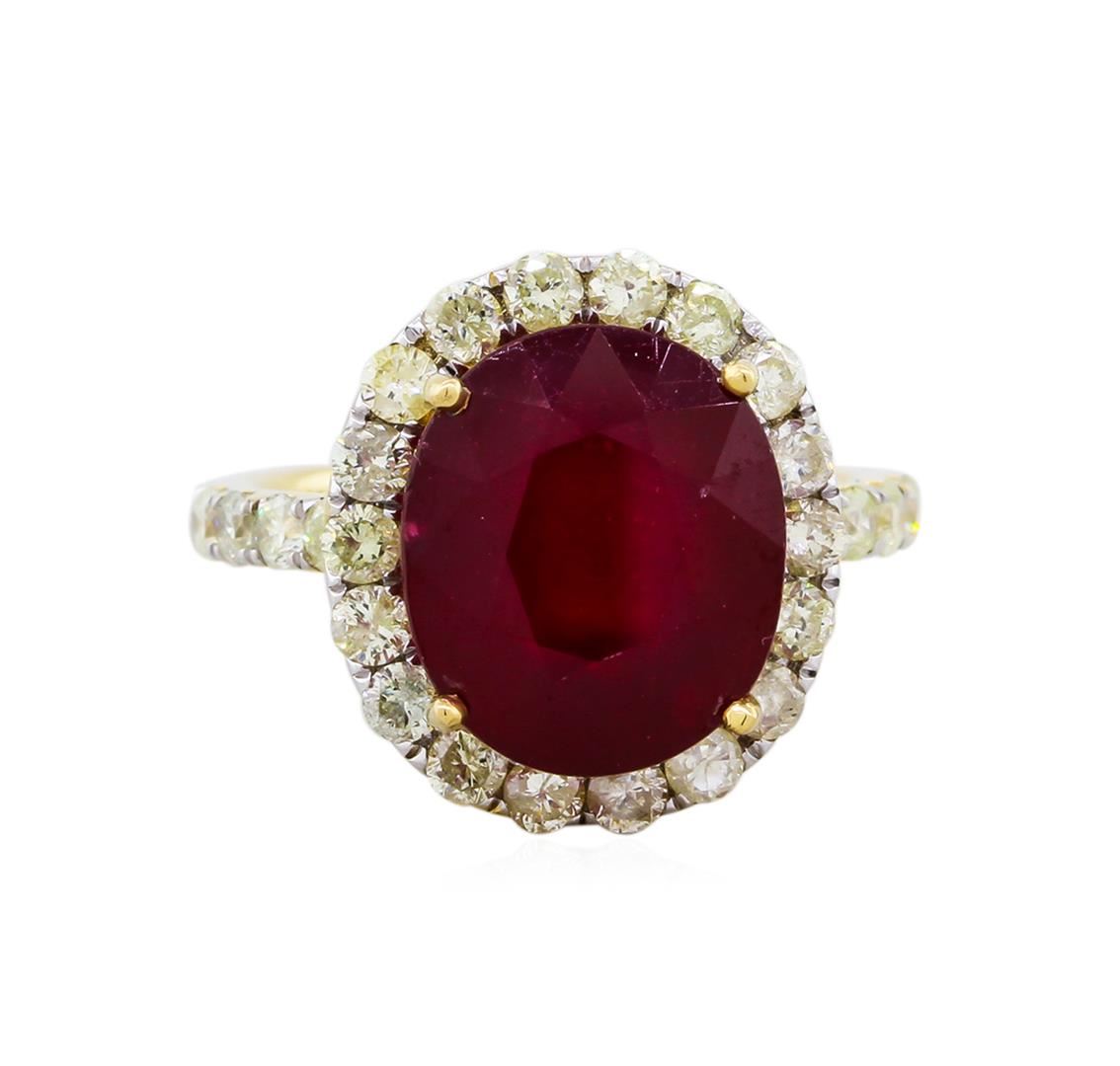 14KT yellow gold ruby and diamond ring. An oval cut ruby corundum gemstone weighing in at an aproximate 10.60 carats is prong mounted in the center of the ring. Approximately 1.85 carats of round brilliant cut diamonds accent the ring around the center gemstones and on both sides. The ring is cast stamped "14K" and has a gross weight of 6.0 grams. The diamond have an average clarity of I1-I2. Ruby color red, intensity is medium. Finish: High polish. Condition: Excellent GGA Appraised at $6,490.00.