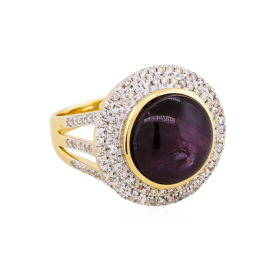 Fourteen Karat (14K) Yellow Gold Star Ruby And Diamond Ring. A Round Cabochon Cut Star Ruby Corundum Gemstone Is Prong Mounted In The Center Of The Ring. Round Brilliant Cut Diamonds Accent The Ring Around And On Both Sides Of The Center Gemstone. The Ring Is Cast Stamped "14K" And Has A Gross Weight Of 10.2 Grams. Diamonds: Shape: Round Brilliant Cut, Weight: 0.84 Carat, Average Clarity: 11-12, Average Color: H-J, Gemstone: Star Ruby, Symmetry: Very Good, Polish: Very Good. Gemstone: Star Ruby Corundum, Nature: Natural (Asterism), Shape: Round, Cabochon, Quantity: 1, Mounted, Weight: 10.63 Carat, Dimensions: Max. Diameter-I I .93 Mm.; Min. Diameter-Il .85 Mm., Bulge: Visible, Clarity: Sl, Type 3, Color: Red (5/5), Symmetry: Very Good, Color Intensity: Medium, Transparency: Transparent, Tone: Dark. Comments: No Indications Of Heating (Unheated). Metal: Gold, Stamped. Purity: 14K, Color: Yellow, Condition: Excellent, Finish: High Polish. GGA Appraised at $6,430.00.