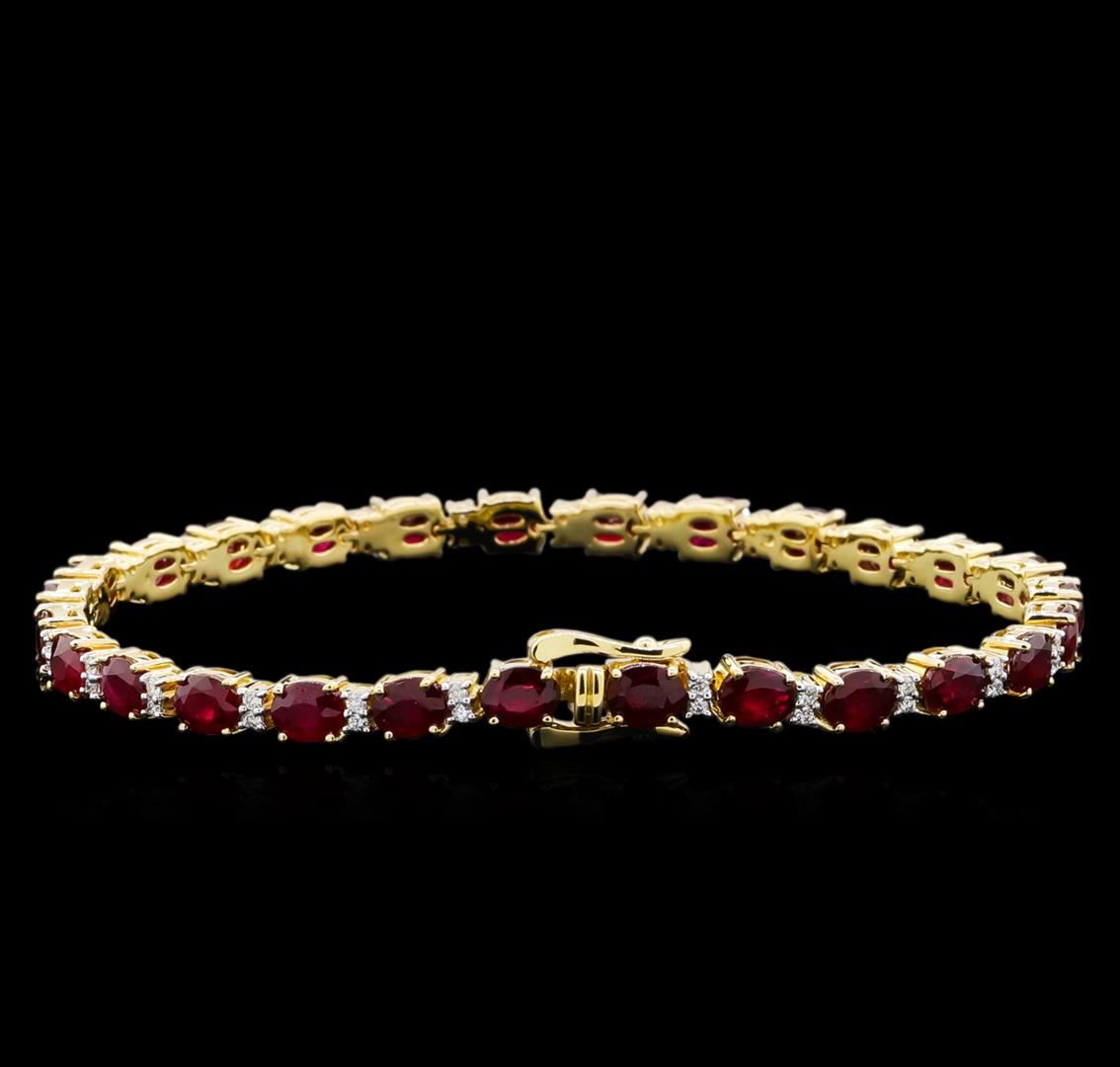 One electronically tested 14KT yellow gold lady's combination cast & assembled fashion straight line tennis bracelet with a tongue clasp with foldover safety with a bright polish finish. The featured lady's bracelet measures 7.25 inches in length. Identified with markings of "14K". Condition is new, good workmanship. Containing: Twenty-seven prong set oval modified brilliant cut natural rubies, measuring 5.20 x 4.00 x 2.52mm, (depth est.) approximate total weight of 11.35ct., clarity is moderately included, medium dark, moderately strong, red color, (GIA R 6/4), cut is good. Transmitting light with no distortion, transparent. Colored gemstones are presumed to have been subjected to commonly used enhancement processes. Graded in the setting.Fifty-Two prong set round brilliant cut diamonds, measuring 1.30 - 1.25 x 0.79mm (depth est.) approximate total weight of 52 Stones = 0.43ct. Graded in the setting. Clarity: VS-2 to SI-1. Color: G - HCut Good. Total Weight of Colored Stones 11.35ct. Total Weight of Diamonds 0.43ct. Total Weight of Straight Line Tennis Bracelet 15.00gm. GAS Appraised.