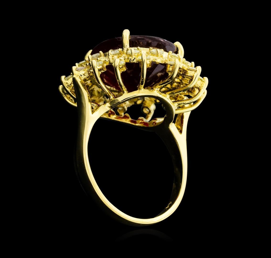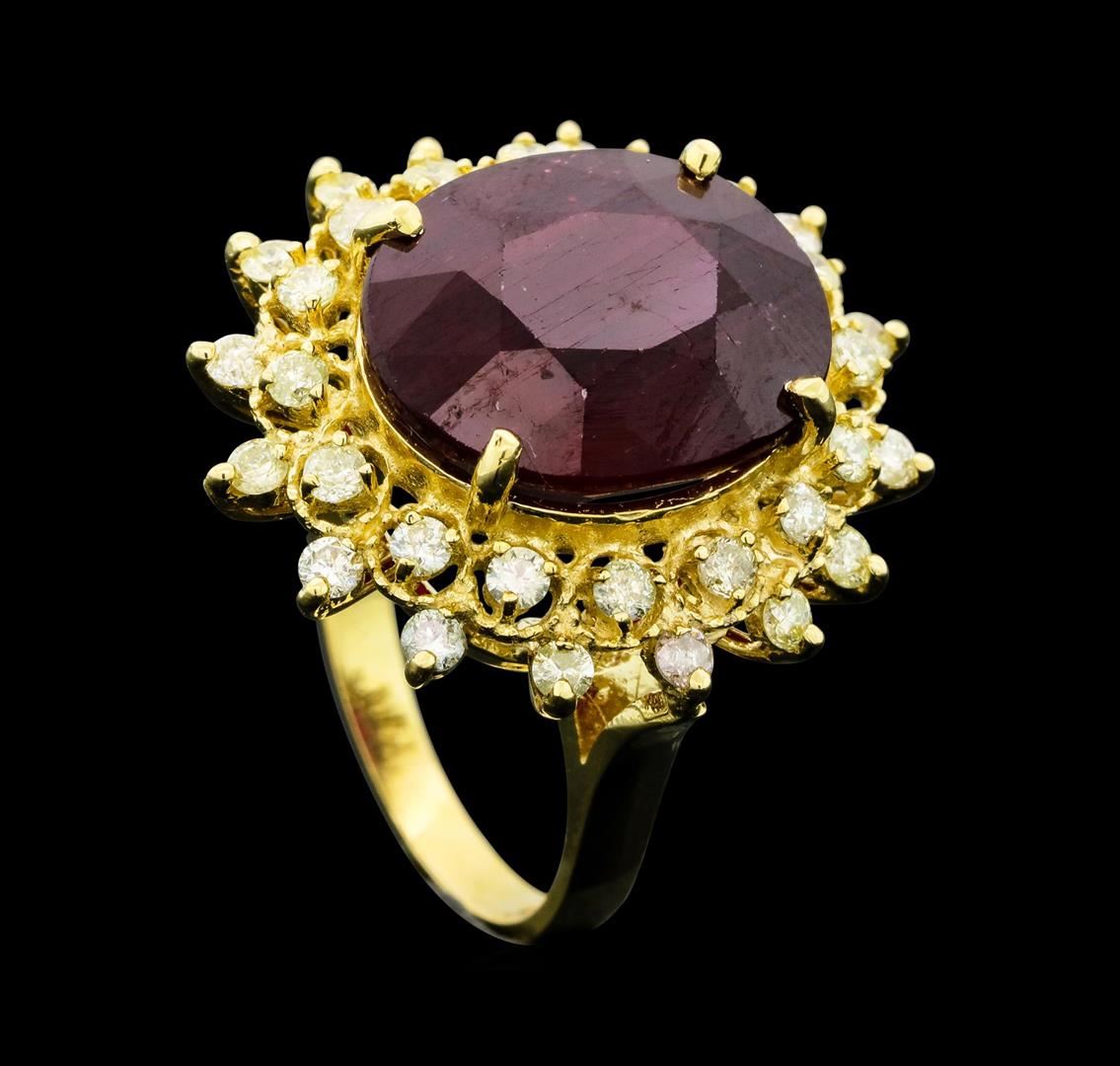 Fourteen karat (14K) yellow gold ruby and diamond ring. An oval cut ruby corundum gemstone is prong mounted in the center of the ring. Round brilliant cut diamonds accent the ring around the center gemstone and on both sides. The ring is cast stamped "14K" and has a gross weight of 7.7 Grams. (1) ruby with a total weight of 11.98cts. (32) diamonds with a total weight of 0.85cts. GA Appraised.