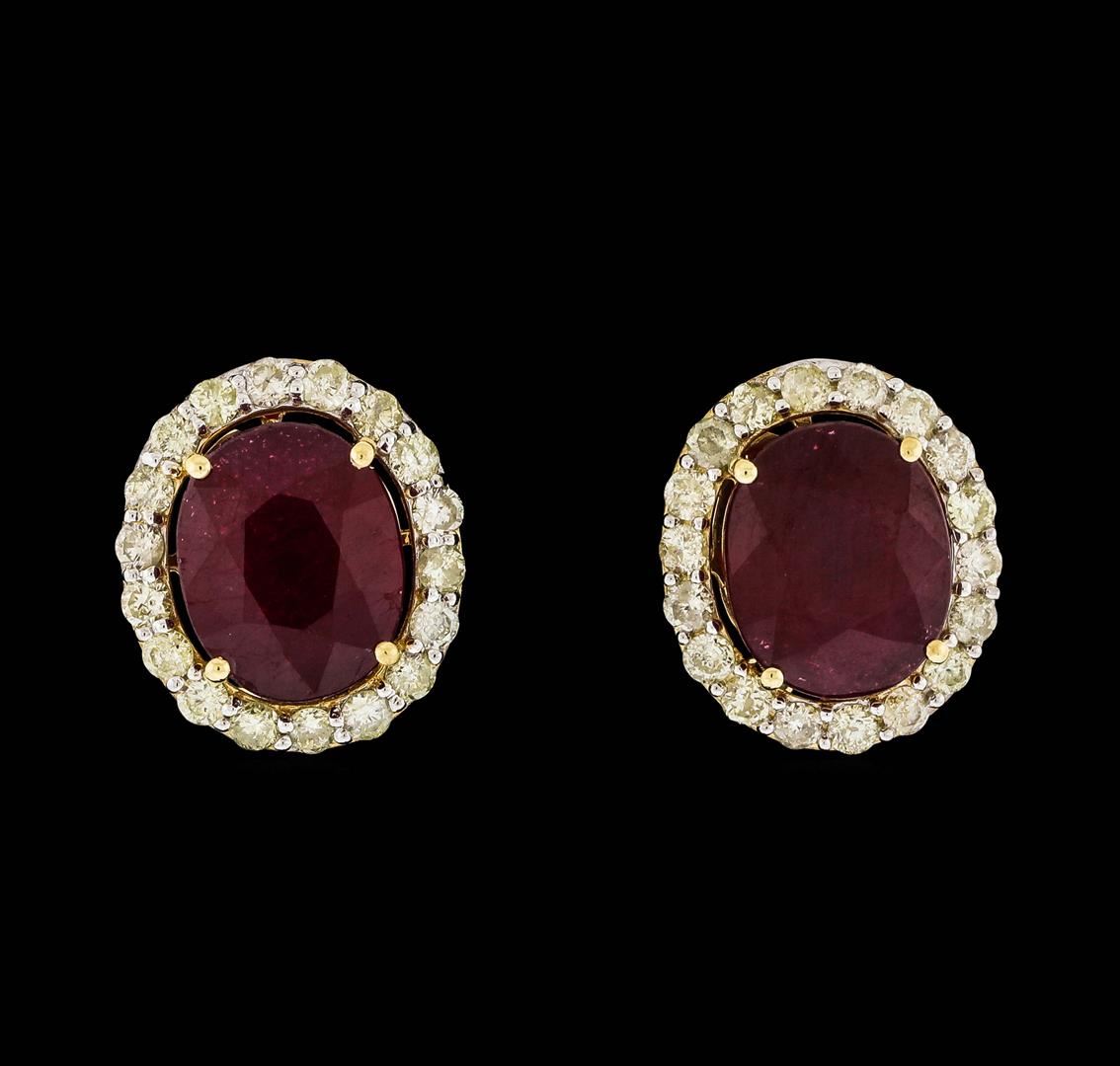 One pair electronically tested 14KT yellow gold ladies cast & assembled ruby and diamond earrings with omega backs. Each earring features a ruby set within a diamond bezel supported by an elaborate lattice under gallery. Bright polish finish with rhodium accents. Trademark is Orianne. Identified with markings of "14K". Condition is new, good workmanship. Containing: Two prong set oval mixed cut natural rubies, measuring 11.00 x 9.00 x 6.50mm, approximate total weight of 12.07ct., clarity is heavily included, type II, dark, very slightly brownish, slightly purplish red color, (GIA slpR 7/3), cut is good. Transmitting light somewhat diffusely, transparent to translucent. Naturally occurring internal & external characteristics are present. Indications of laboratory high temperature heat treatment, with glass & flux additives. Measurements & the color grade are an average for the pair. Graded in the setting. Ruby has a low tolerance to rhodium plating, repolishing the surface, & ultrasonic cleaning. Thirty-Six prong set round brilliant cut diamonds approximate total weight of 36 Stones = 1.29ct. The color grade reflects the entire range of color for this group. Graded in the setting. Clarity: I-1 to I-3. Color: I - L. Total Weight of Colored Stones 12.07ct. Total Weight of Diamonds 1.29ct. Total Weight of Earrings 6.65gm. AIG Appraised.